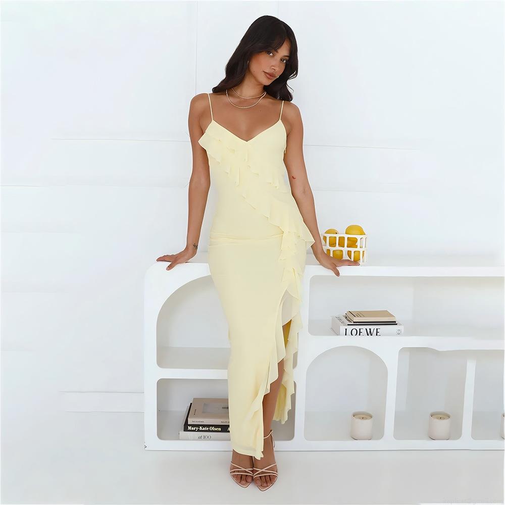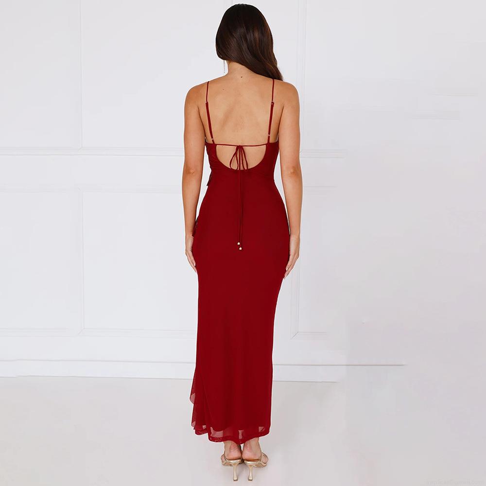 Women's Sexy Backless V-Neck Spaghetti Strap Maxi Dress Summer Ruffle Side Slit Mesh Milk Silk Solid Color Bodycon Long Party Dress