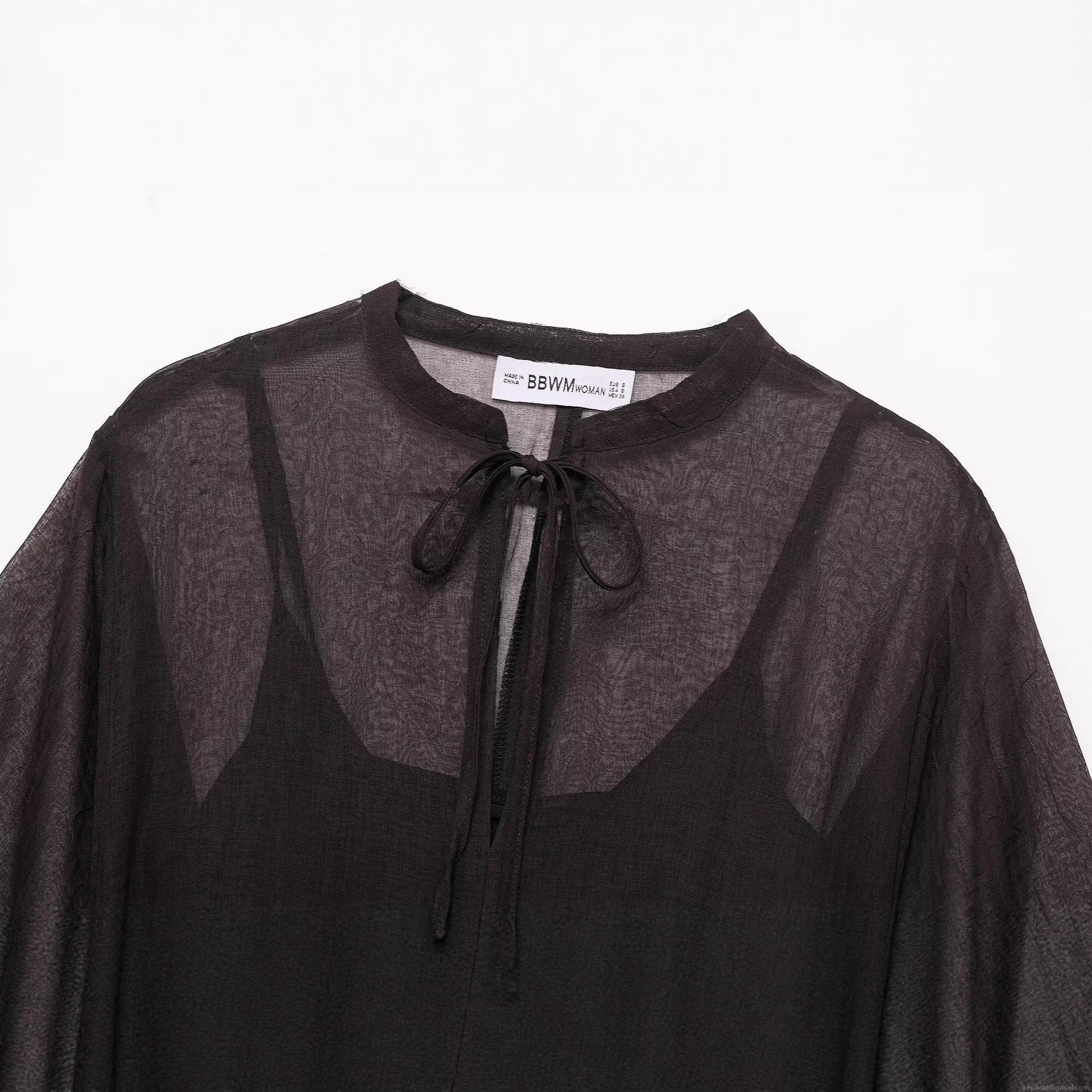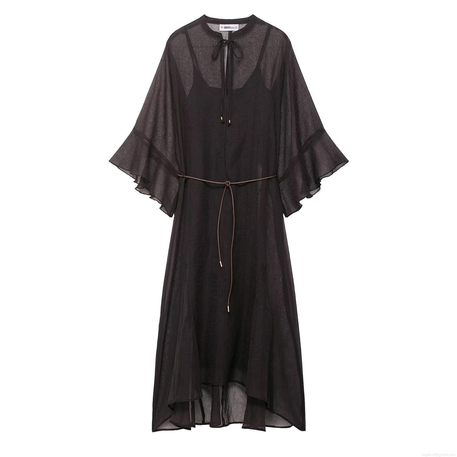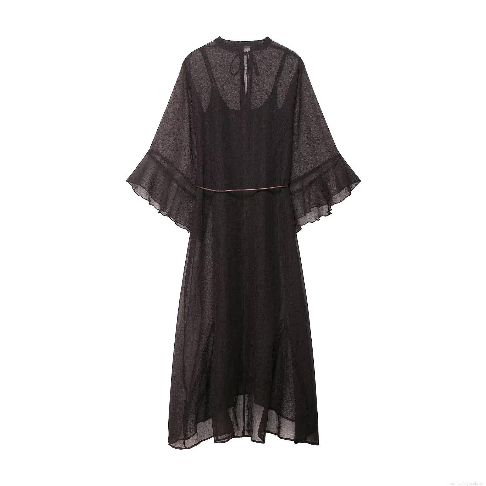 • Women's Sexy Black Chiffon Maxi Dress Ruffle Long Sleeve V-Neck Tie Waist Sheer Patchwork Streetwear Autumn Long Flowy Dress For Party Vacation