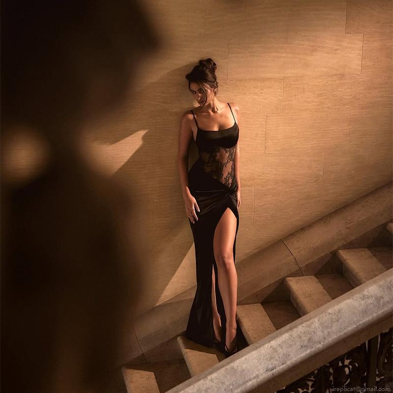 • Women's Sexy Black Evening Maxi Dress Satin Lace Patchwork Spaghetti Straps High Slit Perspective High Waist Slim Fit Dress for Party Club Night Wedding Guest