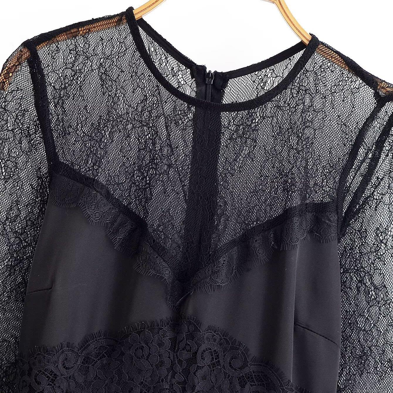 • Women's Sexy Black Lace Patchwork Maxi Dress Elegant Long Sleeve Satin Skirt Slim Fit Round Neck Evening Party Formal Long Gown For Lady