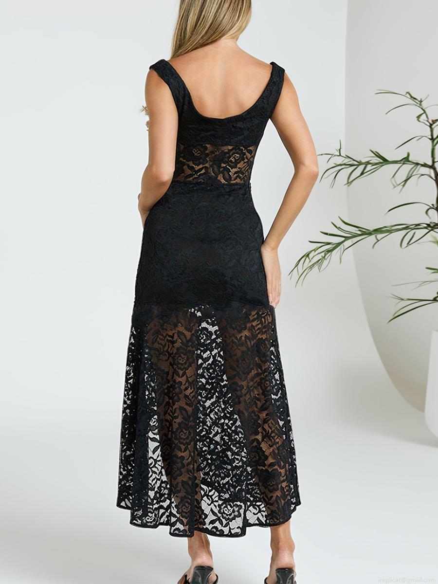 • Women's Sexy Black Lace Sheer Maxi Dress Sleeveless V-Neck High Slit Slim Fit Nightclub Party Evening Bodycon Long Dress