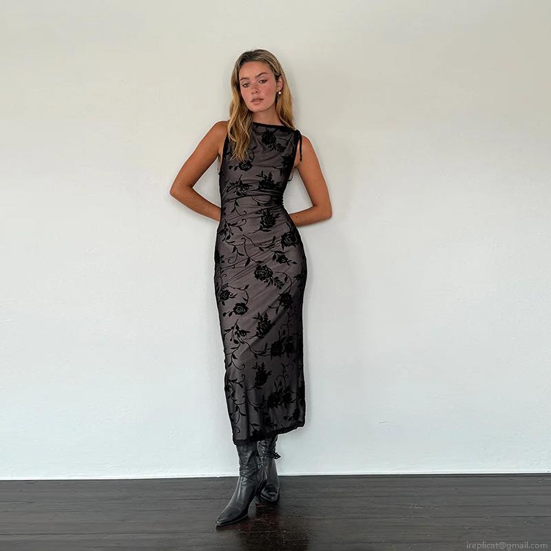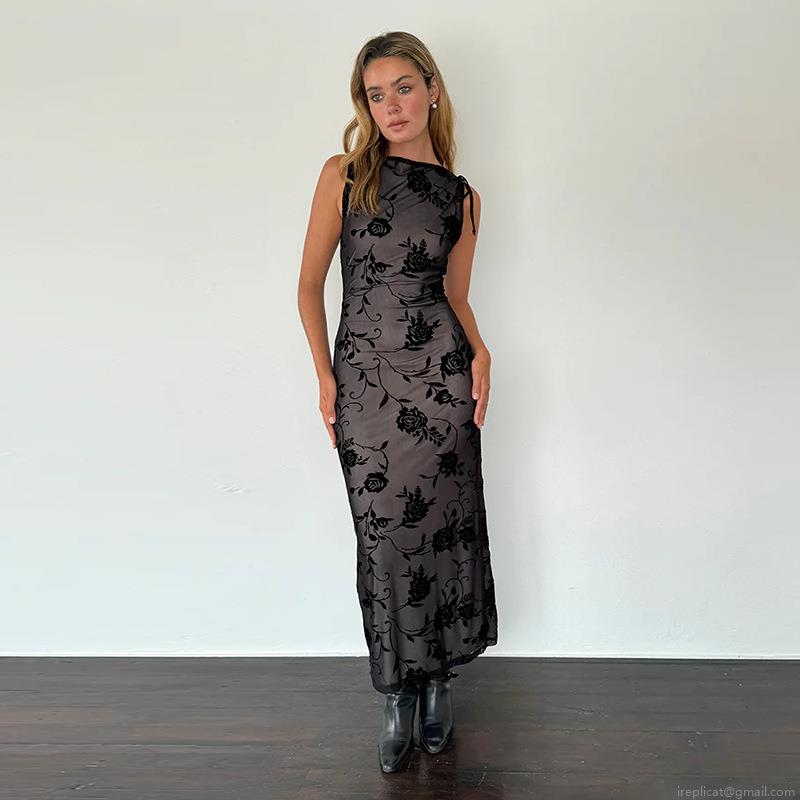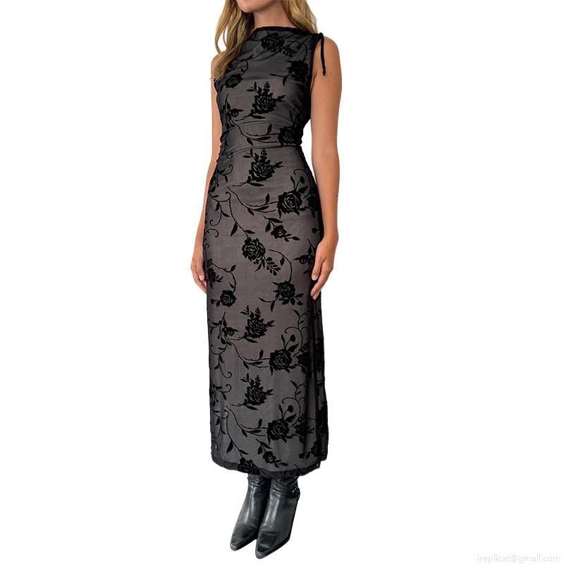Women's Sexy Black Rose Floral Flocked Mesh Sleeveless Maxi Dress Elegant See-Through Bodycon Long Evening Party Clubwear Dress