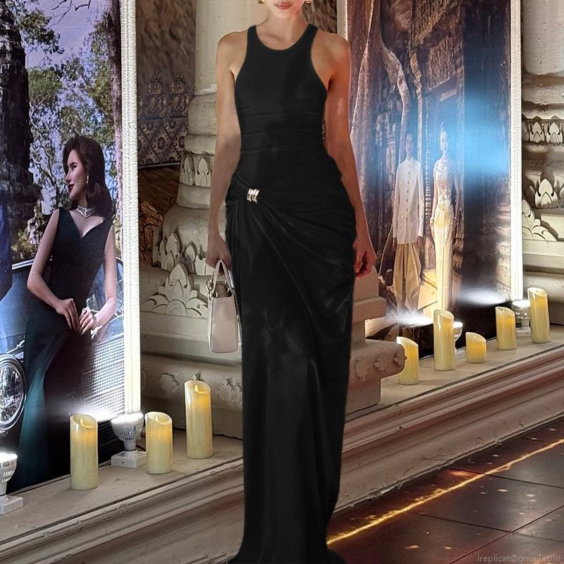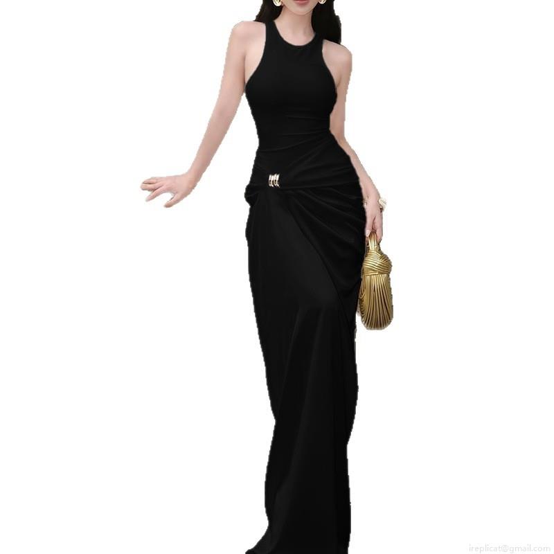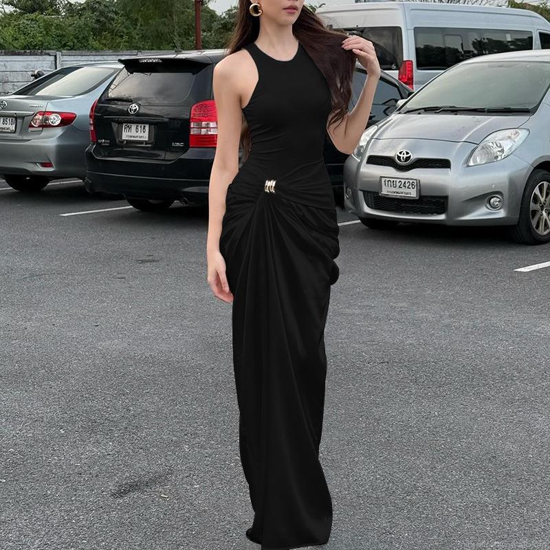 • Women's Sexy Black Satin Patchwork Sleeveless Maxi Dress With Gold Metal Buckle Ruched High Waist A-Line Long Dress For Party Club Evening Streetwear