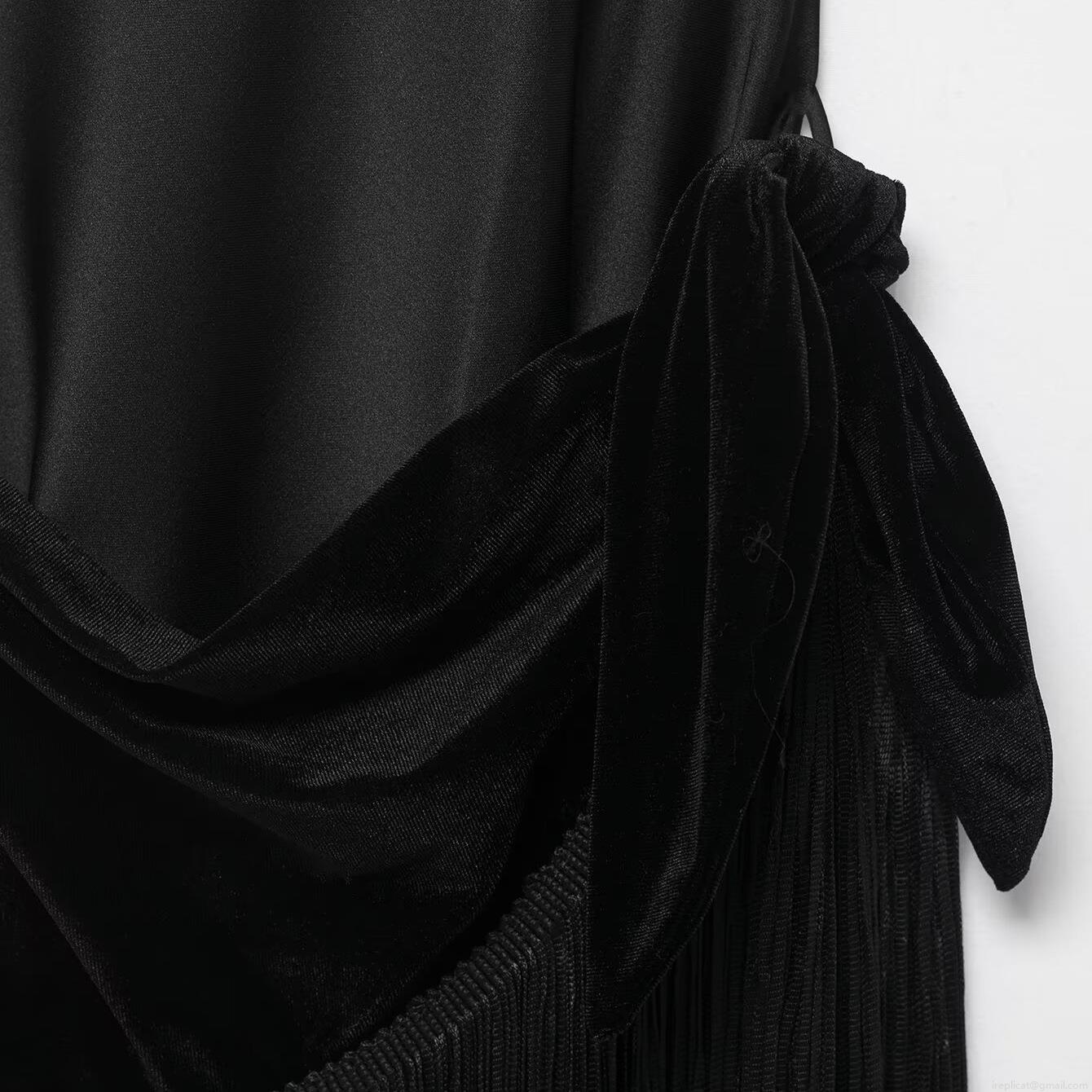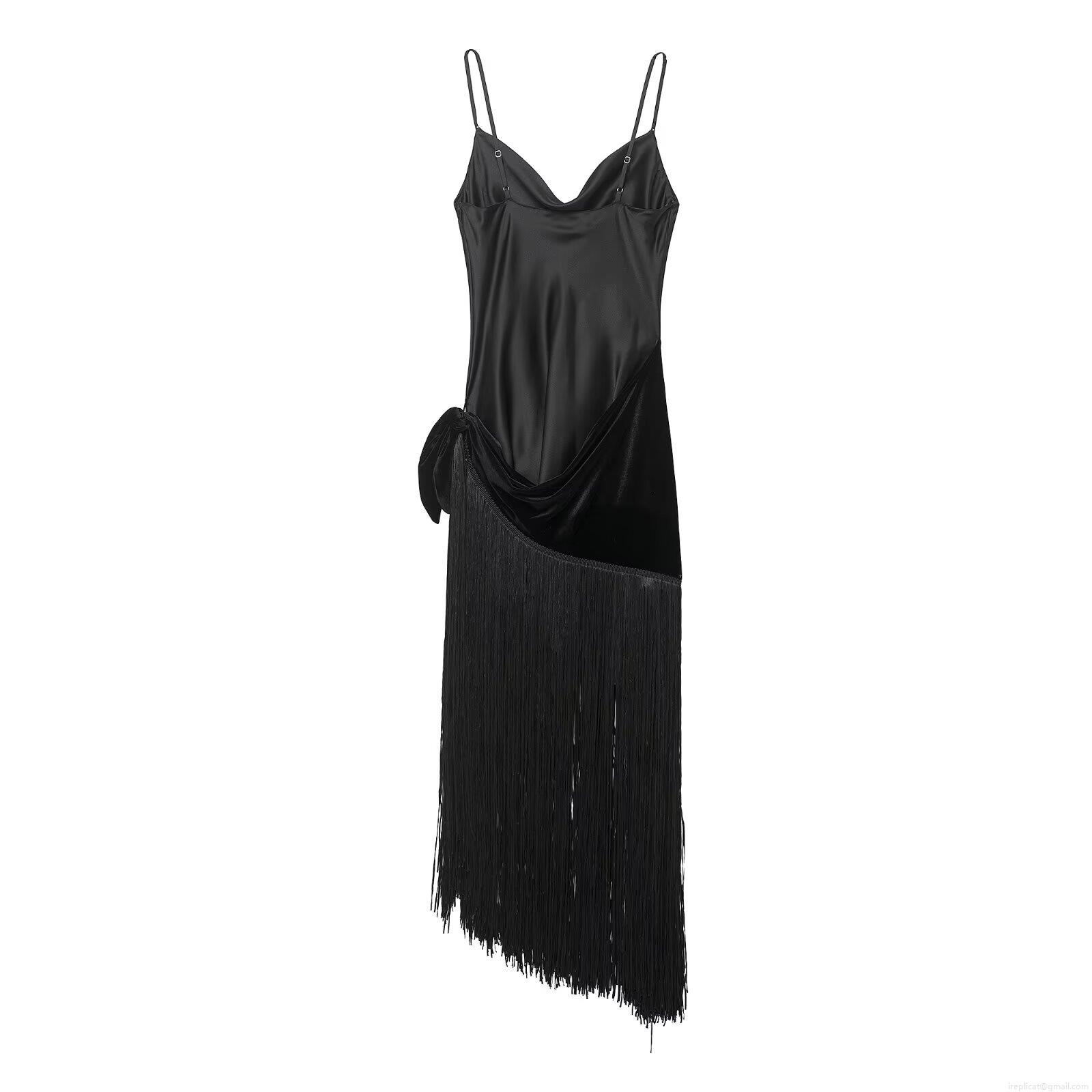 • Women's Sexy Black Satin Velvet Patchwork Cami Maxi Dress With Tassel Fringe Cowl Neck Sleeveless Slim Fit Elegant Evening Party Gown