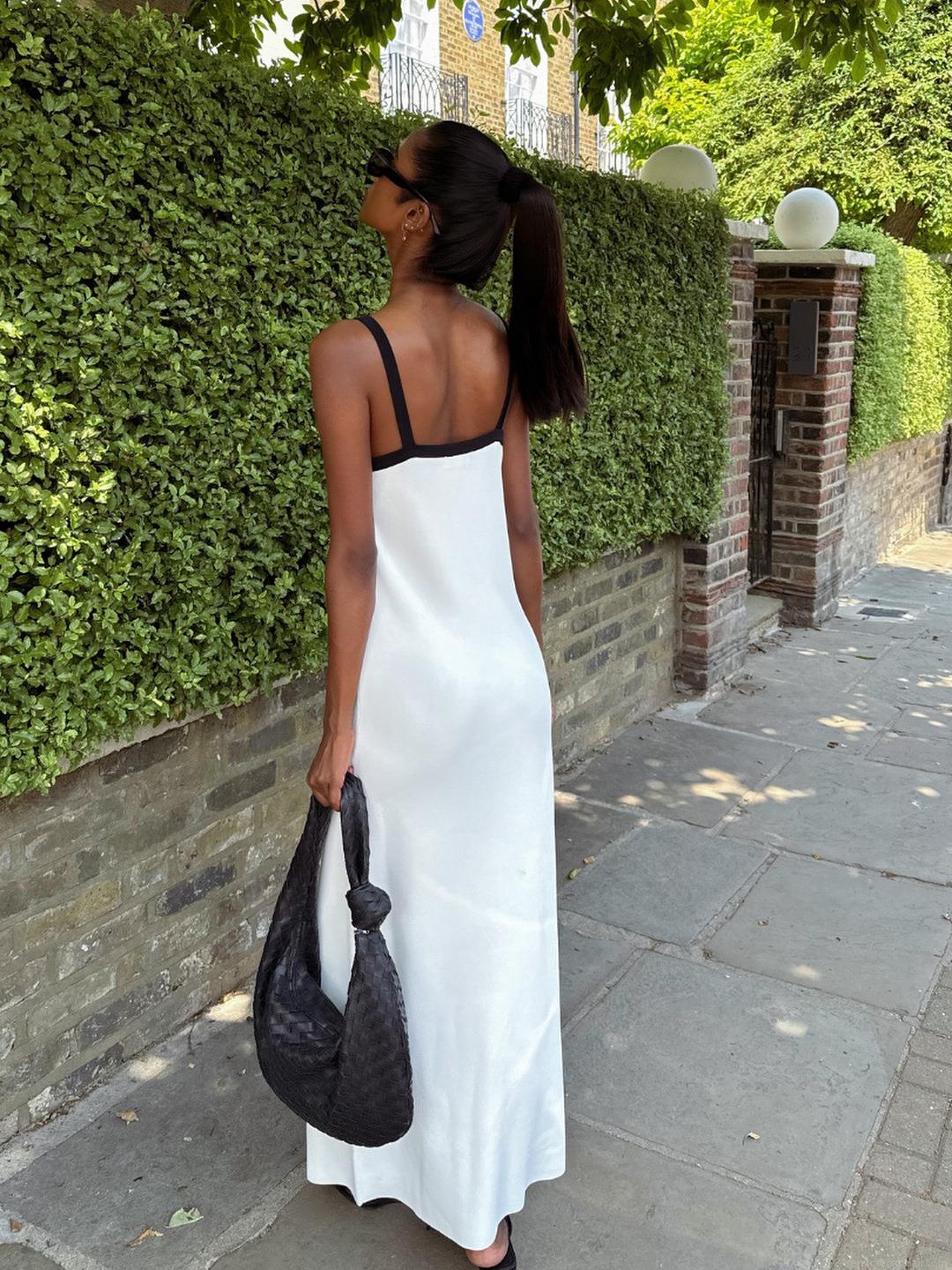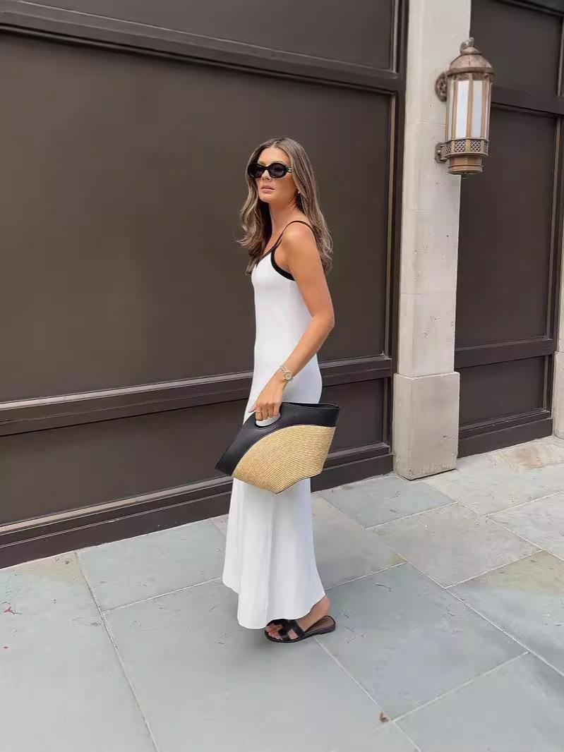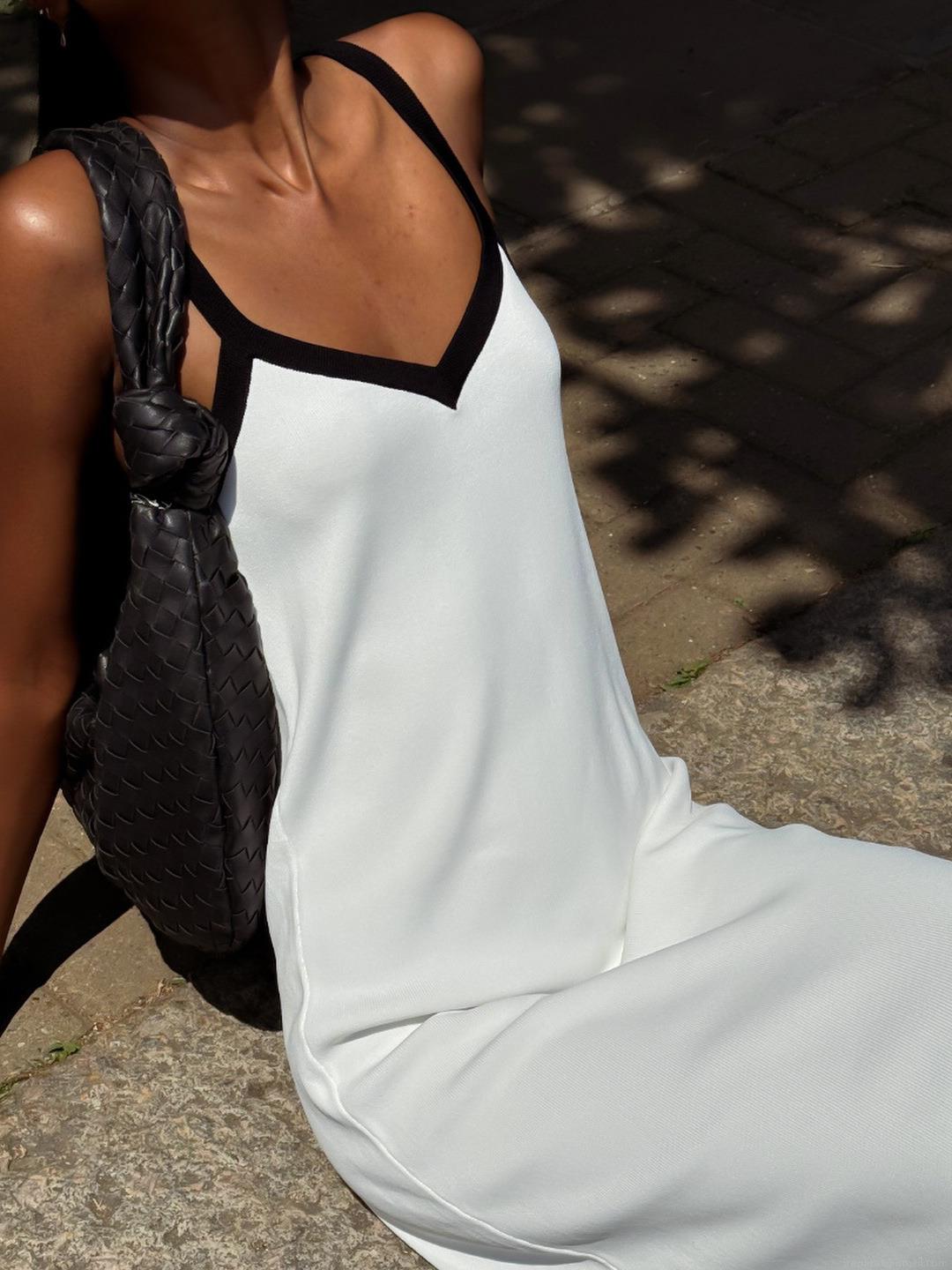 • Women's Sexy Contrast V-Neck Sling Maxi Dress Knitted Cotton Blend Sleeveless Bodycon Long Dress for Summer Vacation Party Beachwear