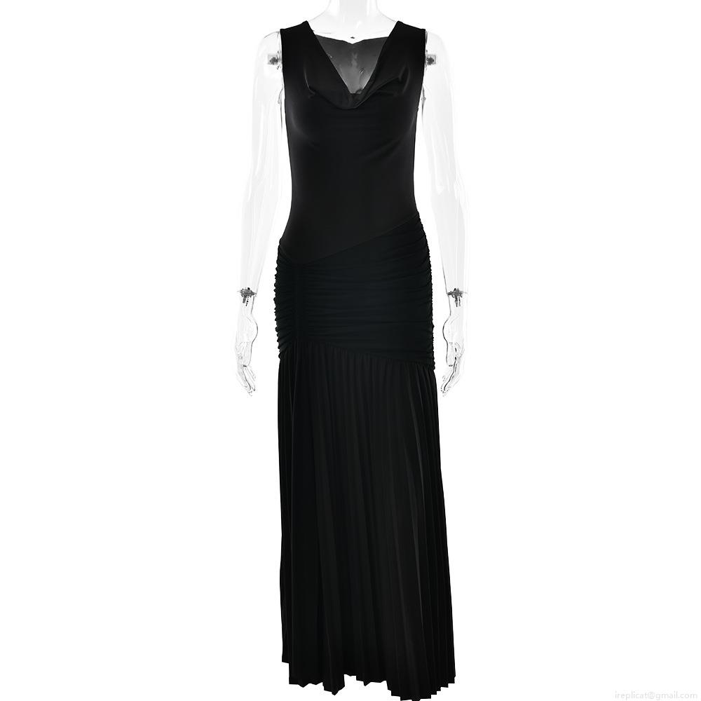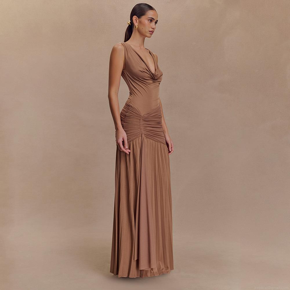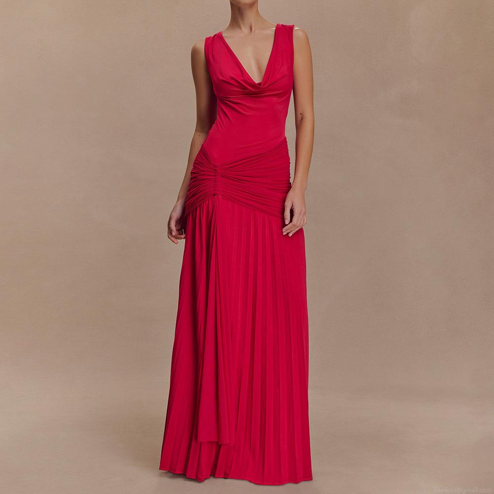 • Women's Sexy Cowl Neck Sleeveless Maxi Dress Elegant Ruched Waist Pleated Evening Gown Milk Silk Solid Color Party Long Dress for Ladies