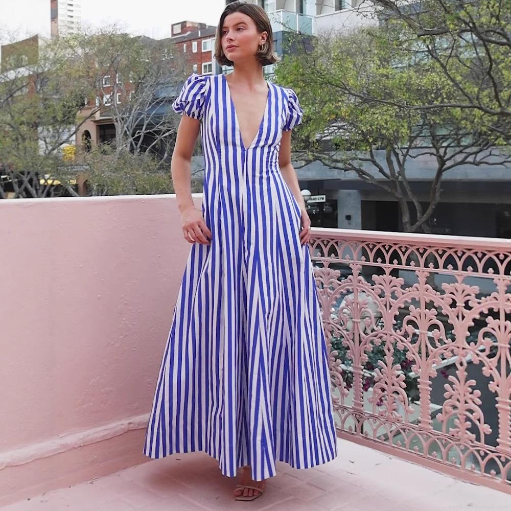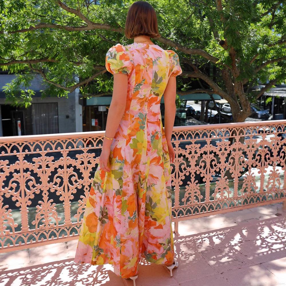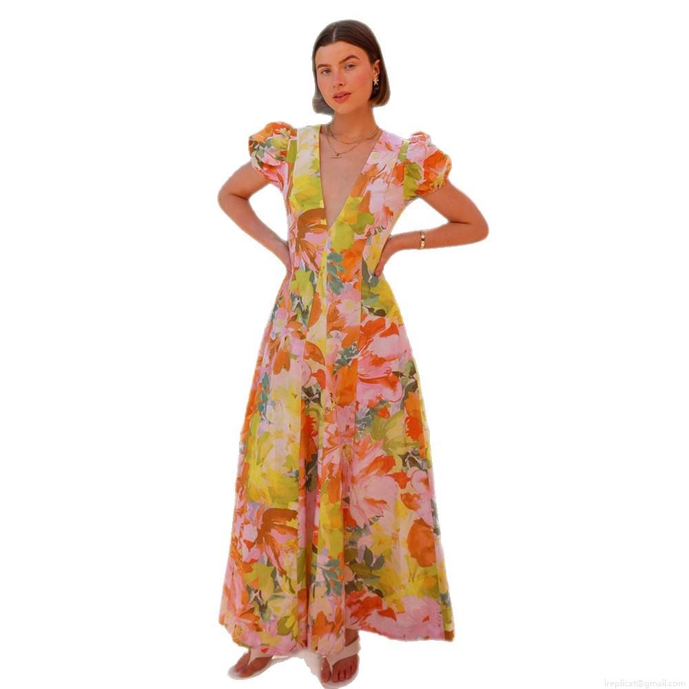 Women's Sexy Deep V Neck Floral Printed Maxi Dress Elegant Puff Sleeve Big Swing Summer Vacation Beach Long Dress Fashion Women Outfits