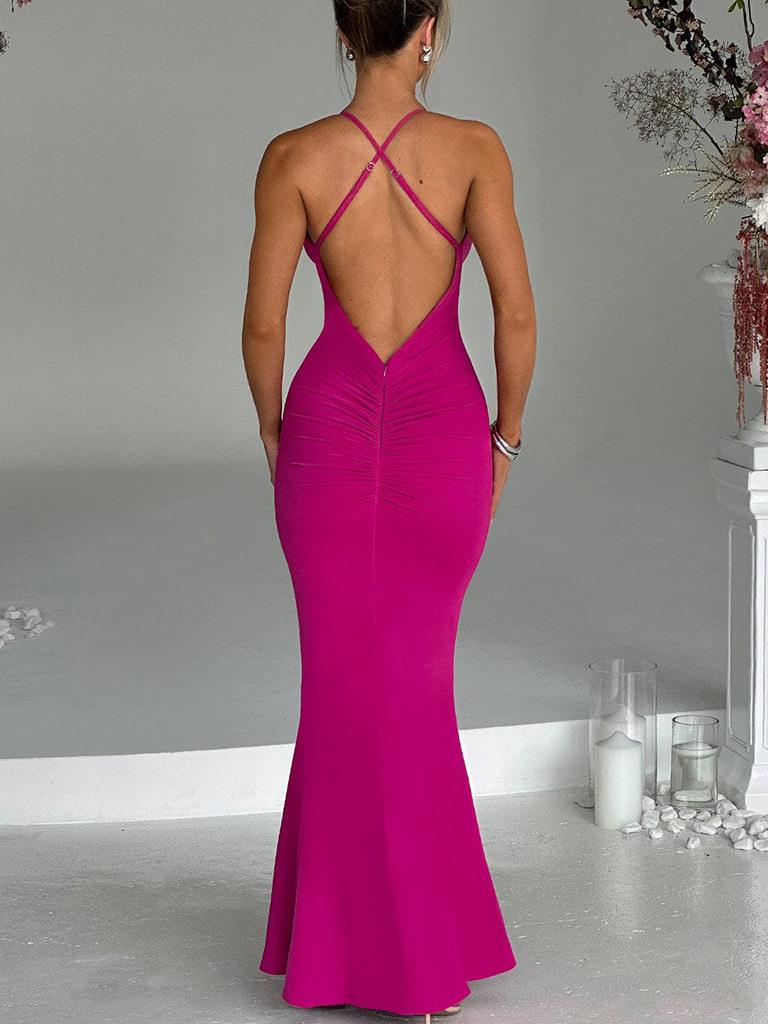 • Women's Sexy Deep V Neck Halter Maxi Dress 3D Flower Ruffle Backless Bodycon Evening Party Gown Solid Color Polyester Spandex Long Dress