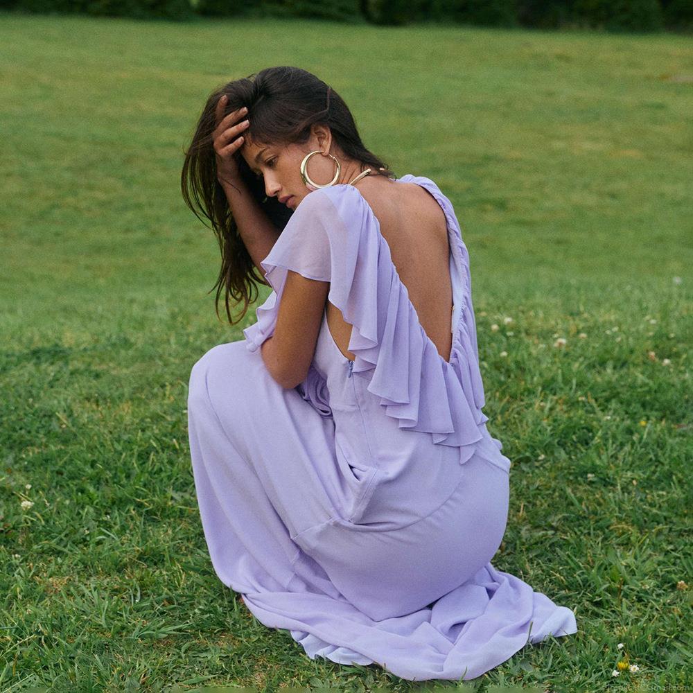 Women's Sexy Deep V-Neck Layered Ruffle Backless Maxi Dress Sleeveless Chiffon Patchwork Tie Back Slim Fit Long Dress For Vacation Party