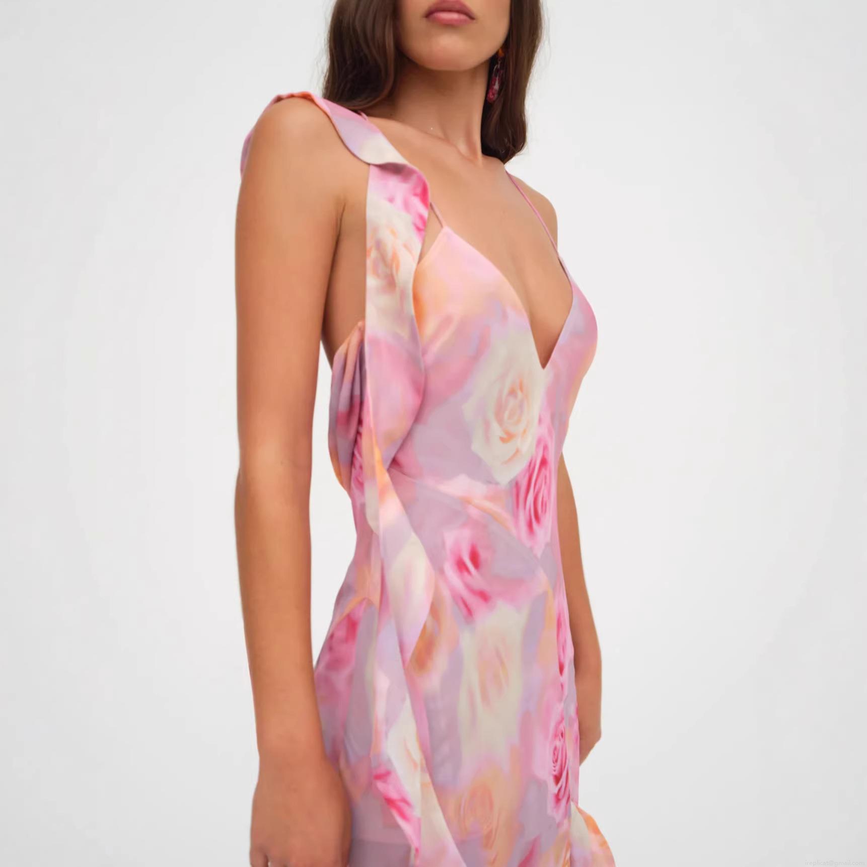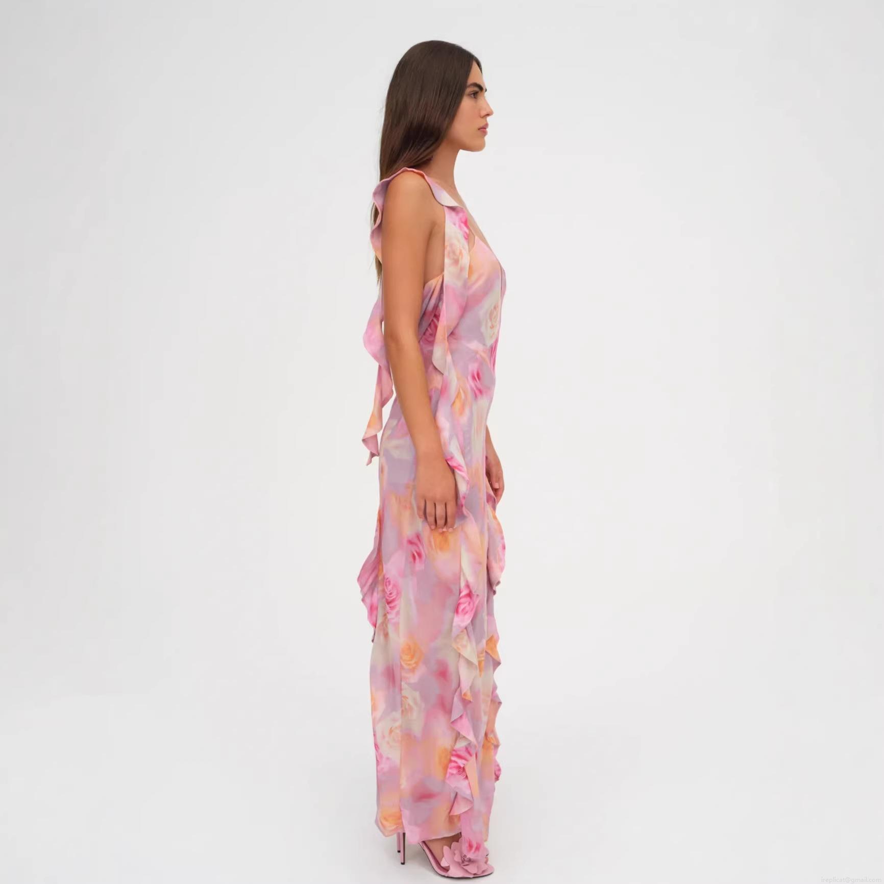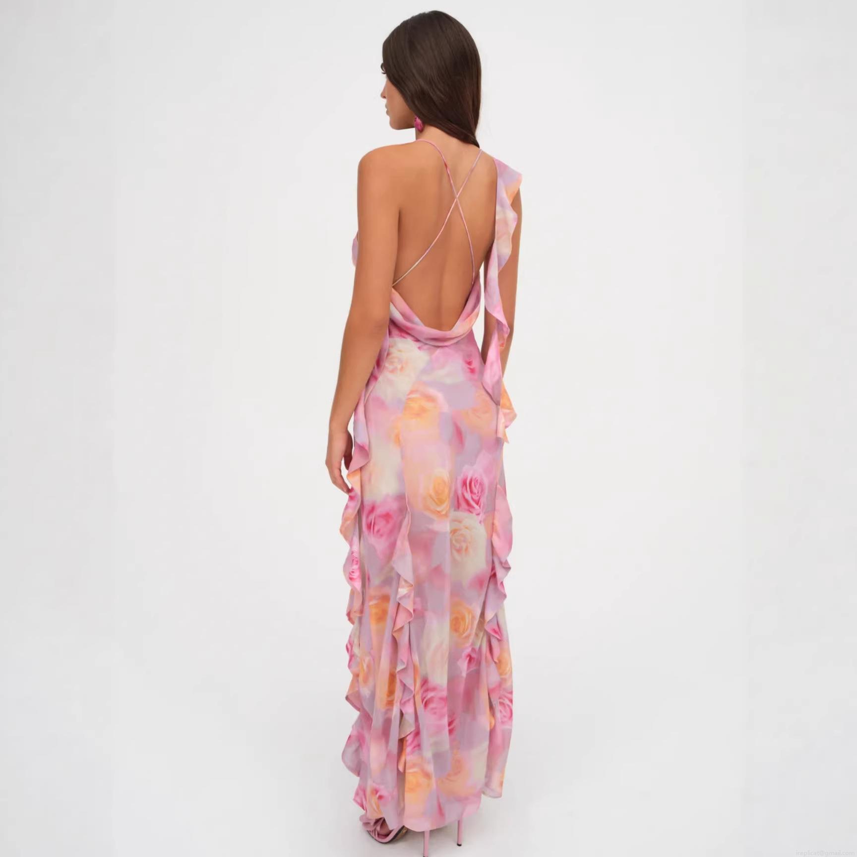 • Women's Sexy Elegant Rose Floral Print Maxi Dress Sleeveless Backless Ruffle Trim Side Slit Camisole Bodycon Dress For Vacation Party Date Night