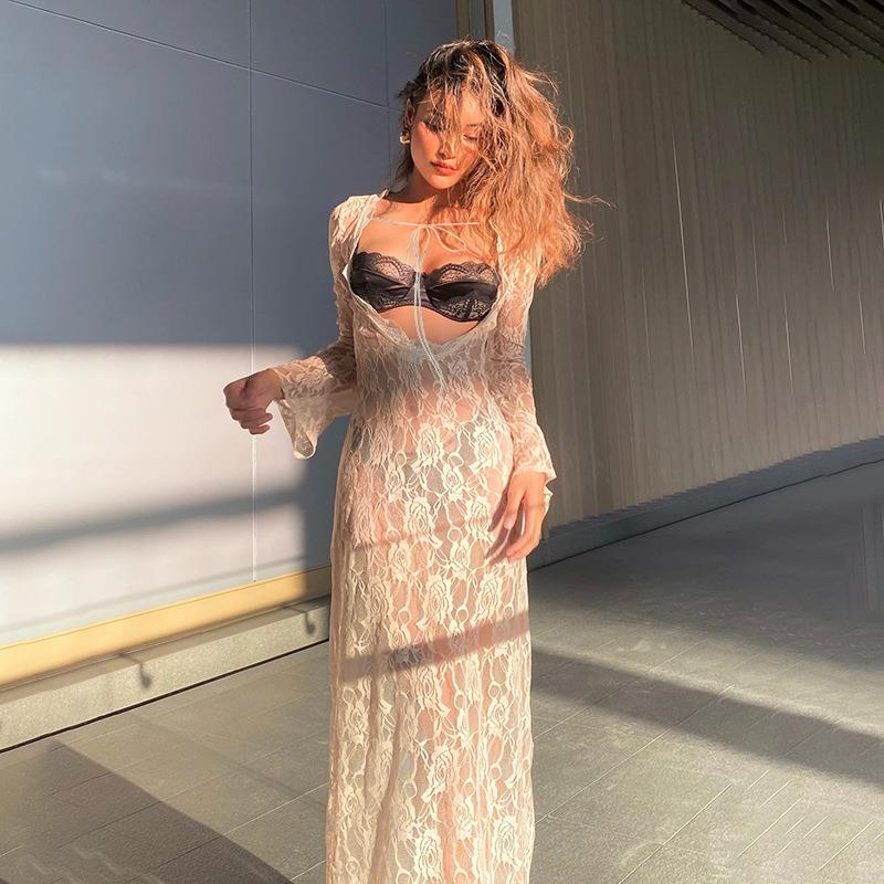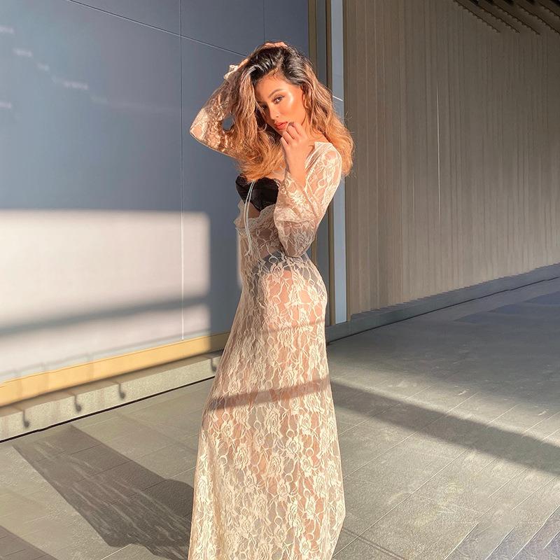 • Women's Sexy Floral Lace See-Through Maxi Dress Long Sleeve U-Neck Reversible Tie Back Hollow Out Elegant Long Dress For Vacation Beach Party