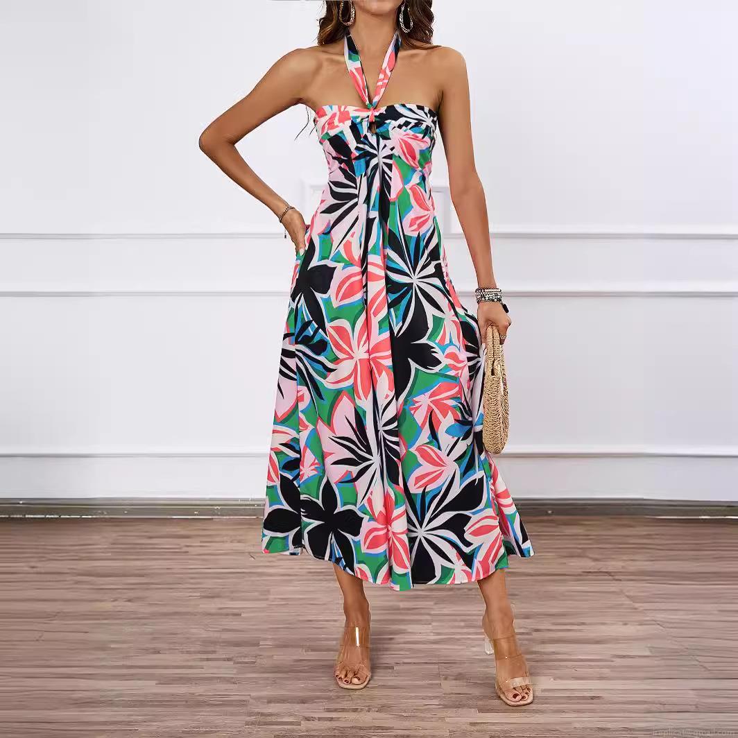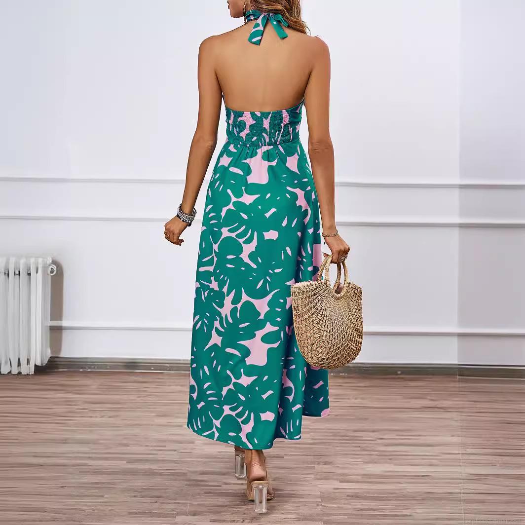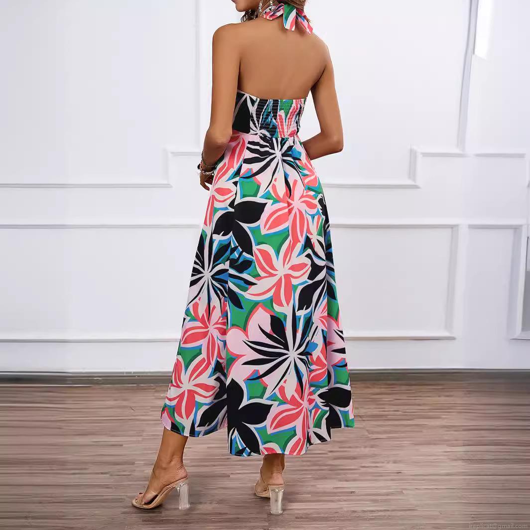 Women's Sexy Floral Print Halter Maxi Dress Backless Hollow Out Polyester Bohemian Beach Vacation Long Swing Dress