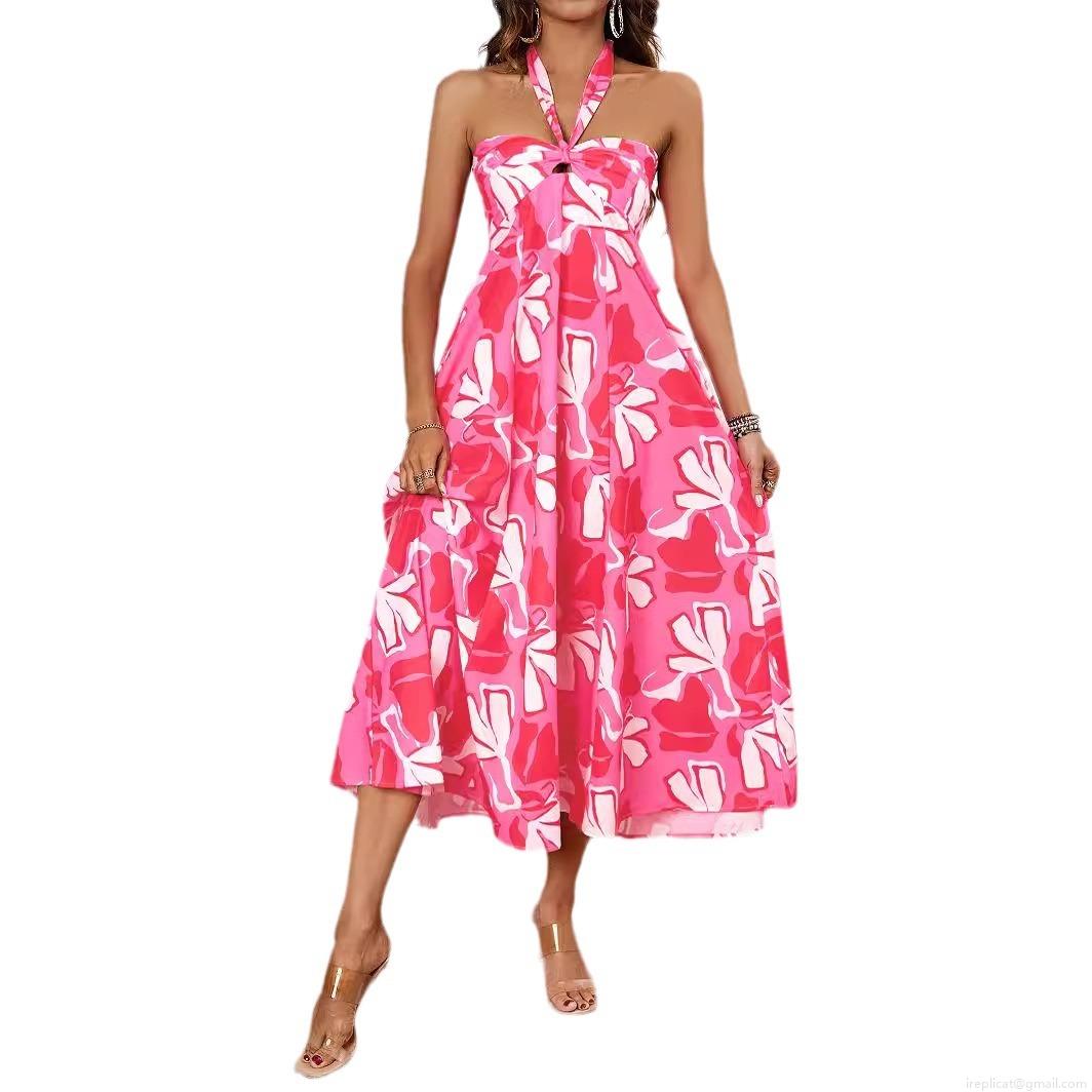 • Women's Sexy Floral Print Halter Maxi Dress Backless Hollow Out Polyester Bohemian Beach Vacation Long Swing Dress