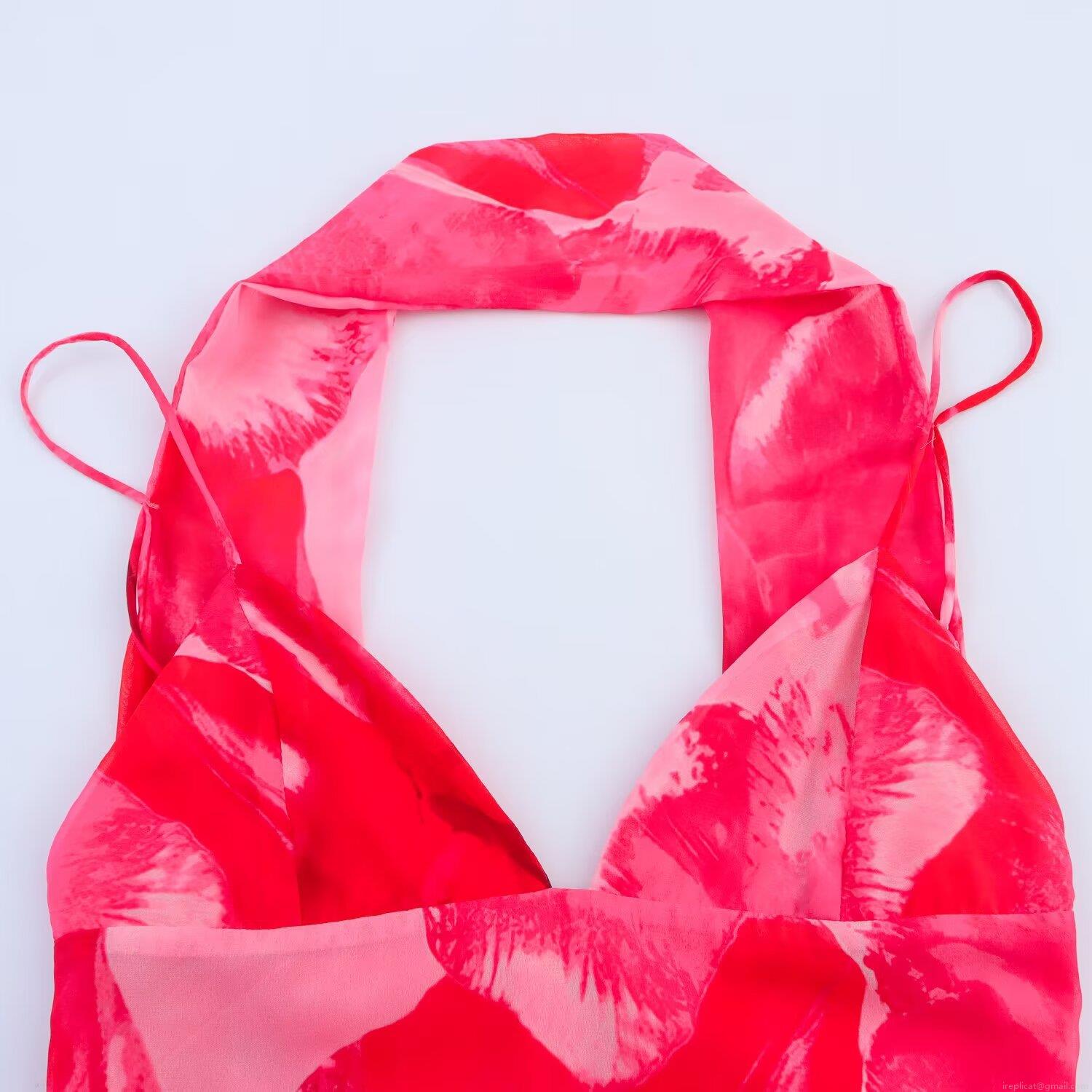 • Women's Sexy Floral Print Halter Neck Backless Maxi Dress Elegant V-Neck Lace-Up Chiffon Long Dress For Summer Vacation Beach Party Pink Red