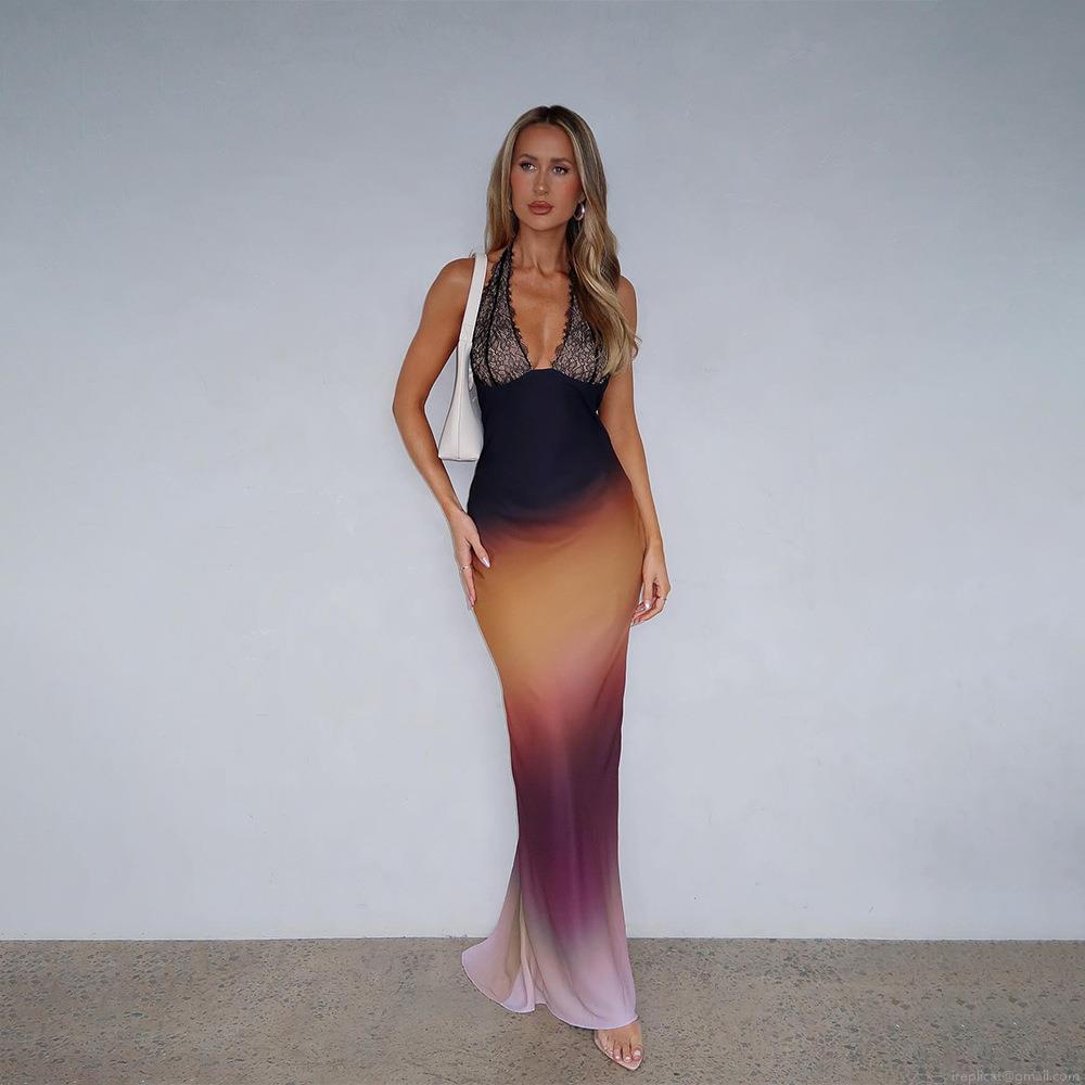 Women's Sexy Gradient Lace Patchwork Maxi Dress Halter V-Neck Backless Slim Fit Polyester Chiffon Evening Party Long Dress