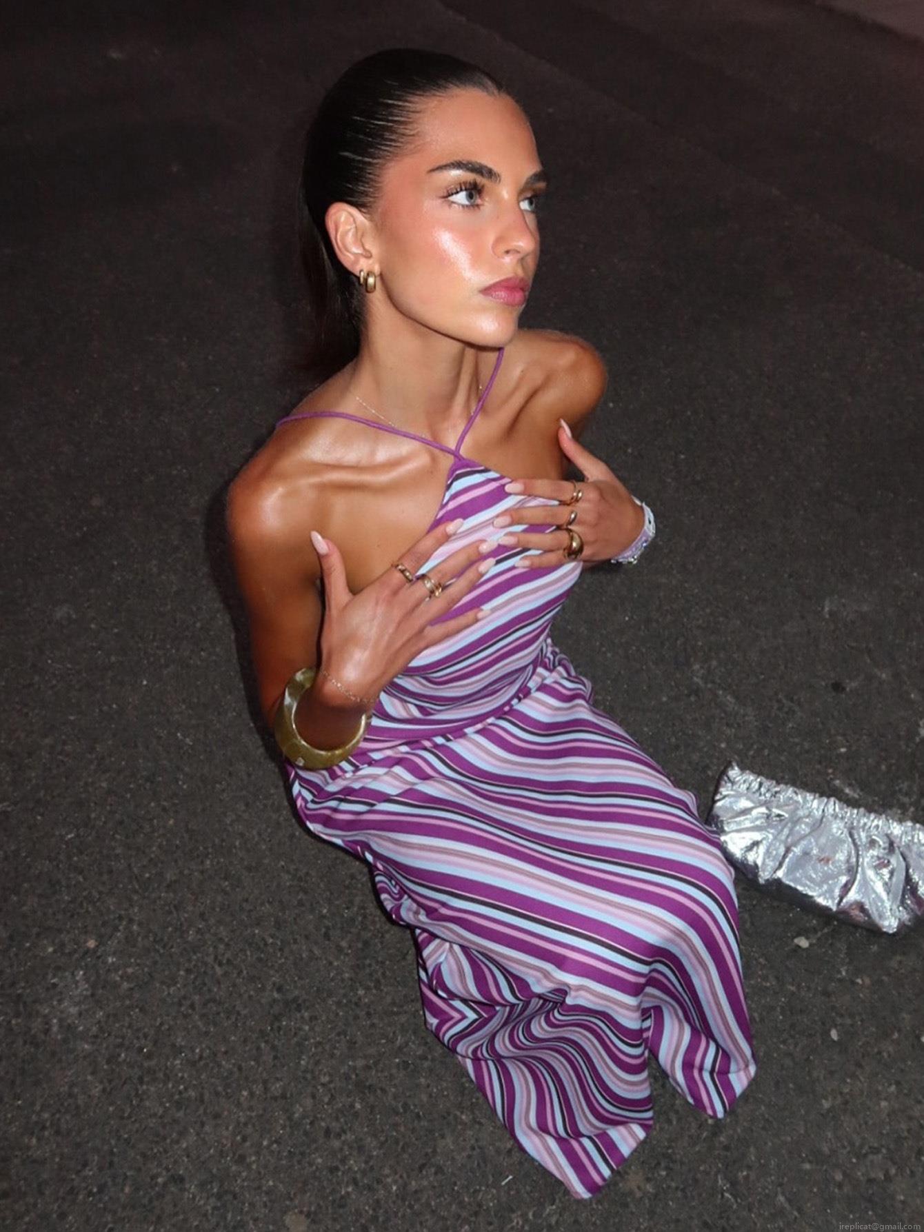 • Women's Sexy Halter Backless Maxi Dress Colorful Striped Print Sleeveless Polyester Spandex Long Dress For Summer Beach Party Elegant Ladies Sundress