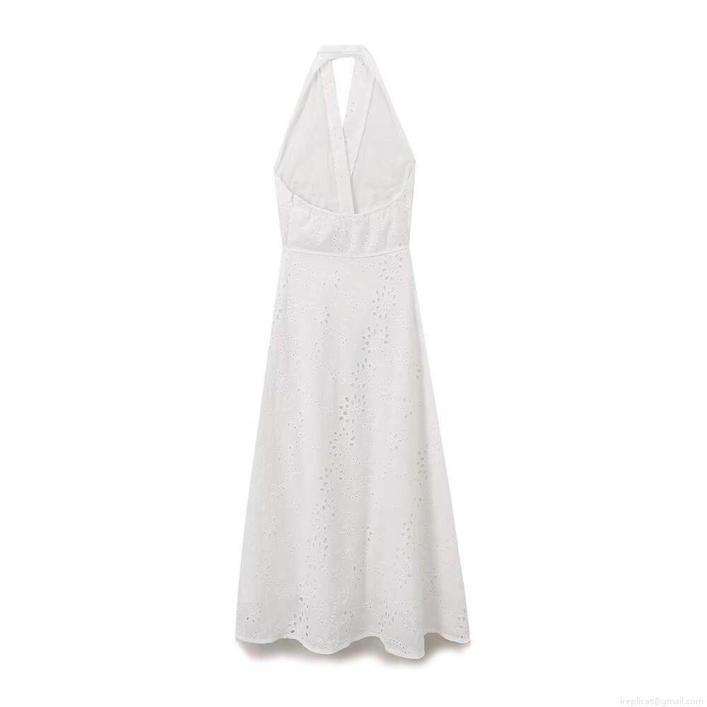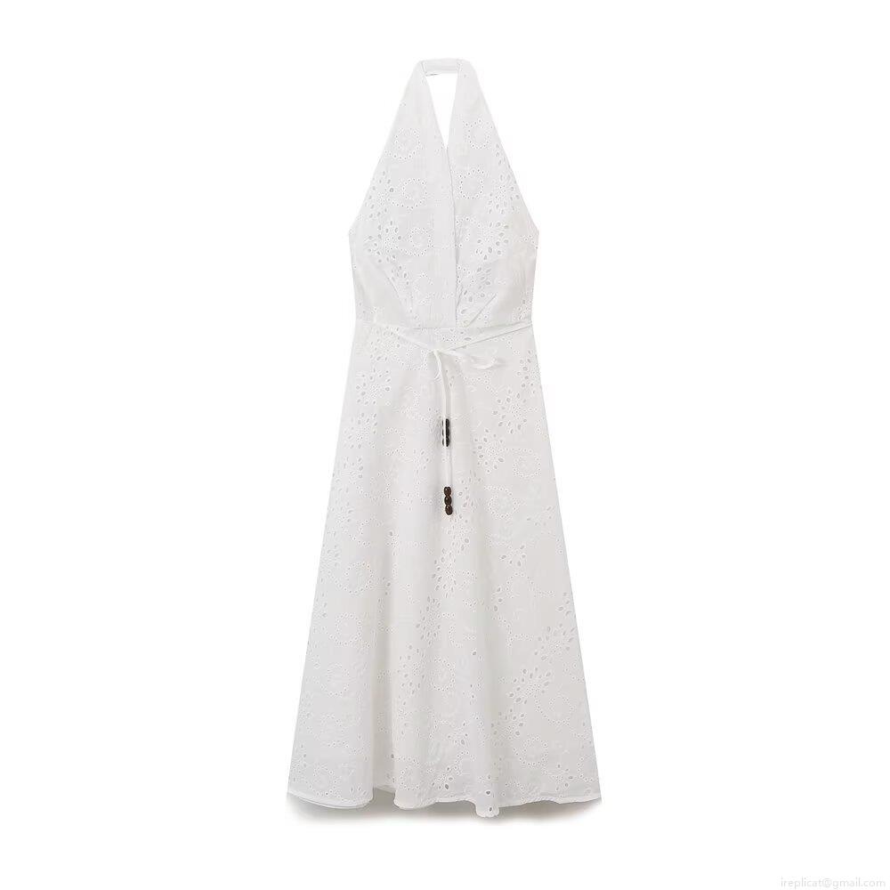 • Women's Sexy Halter Backless Maxi Dress Elegant Cotton Blend Hollow Out Embroidery Dress With Wooden Beads V-Neck A-Line Summer Vacation Beach Dress