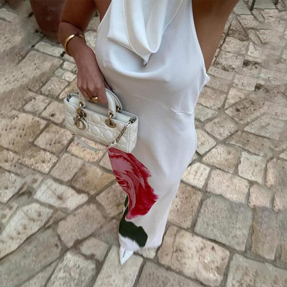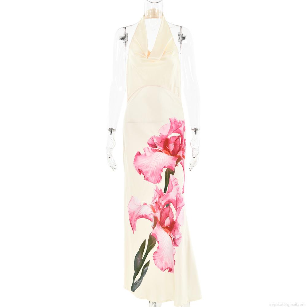• Women's Sexy Halter Maxi Dress Satin Polyester Backless Cowl Neck Floral Print Elegant A-Line Long Dress For Summer Party Evening