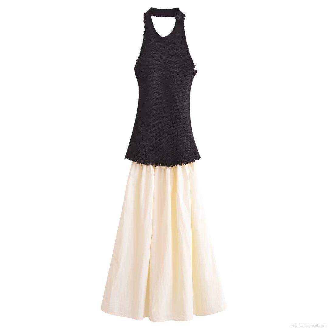 Women's Sexy Halter Neck Backless Patchwork Maxi Dress Elegant Black Tweed Knit Top Off White Spliced Long Dress Streetwear Chic Party Clubwear
