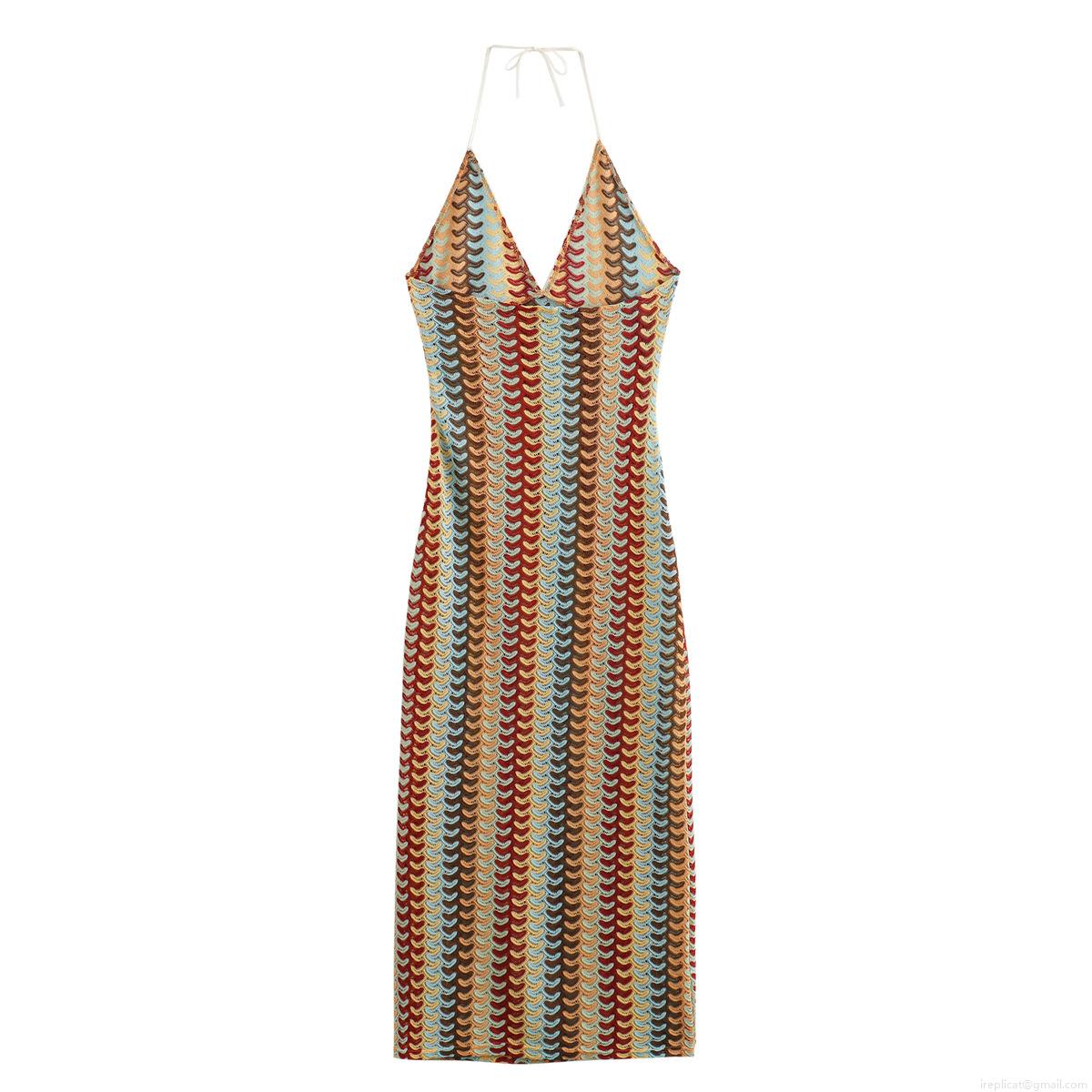 • Women's Sexy Halter Neck Crochet Multi Color Wave Pattern Maxi Dress Summer Boho Backless Bodycon Knit Long Dress For Vacation Party