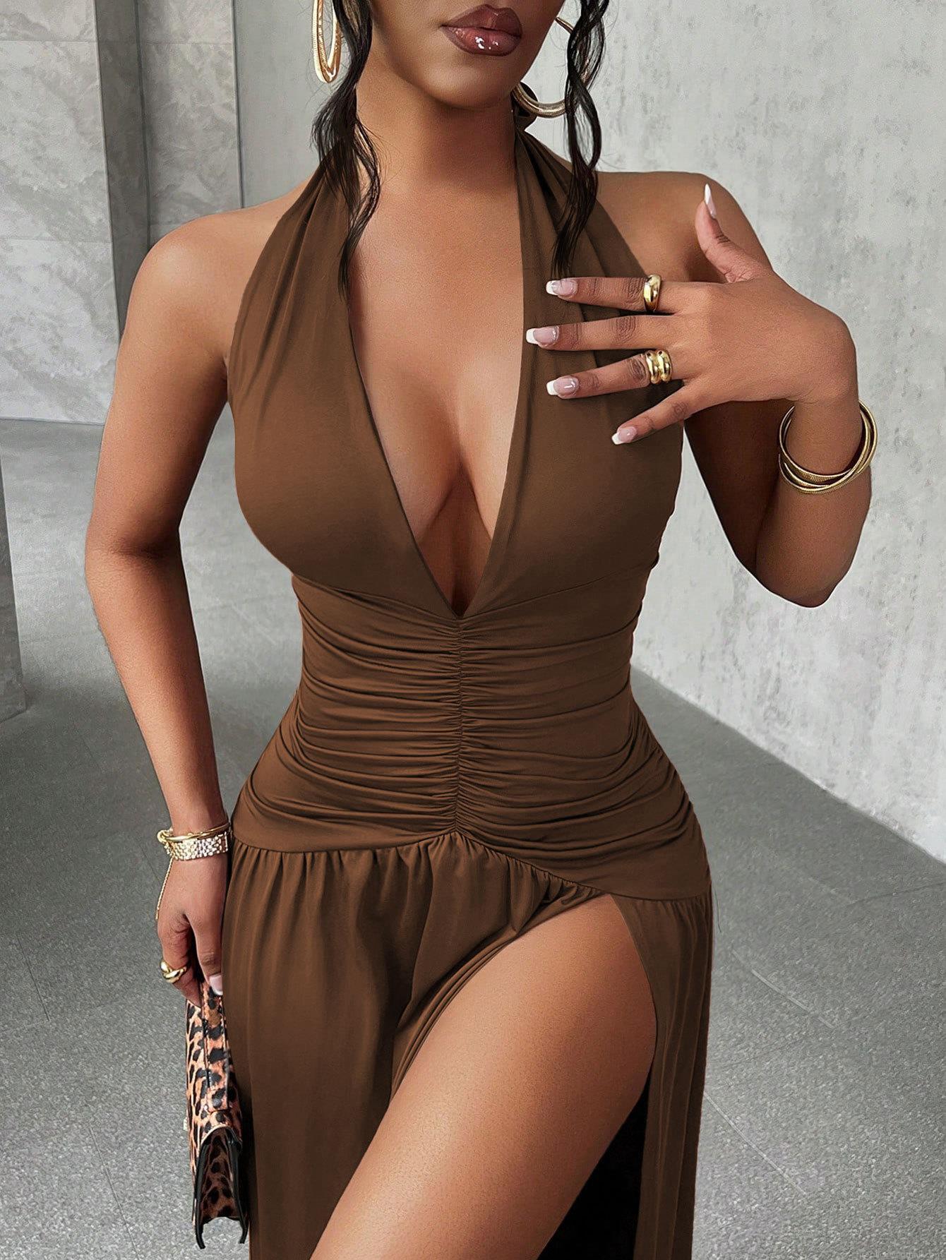 • Women's Sexy Halter Neck Deep V-Neck Maxi Dress High Slit Ruched Bodycon Backless Long Dress For Party Club Evening Cocktail Solid Color Polyester Spandex Gown