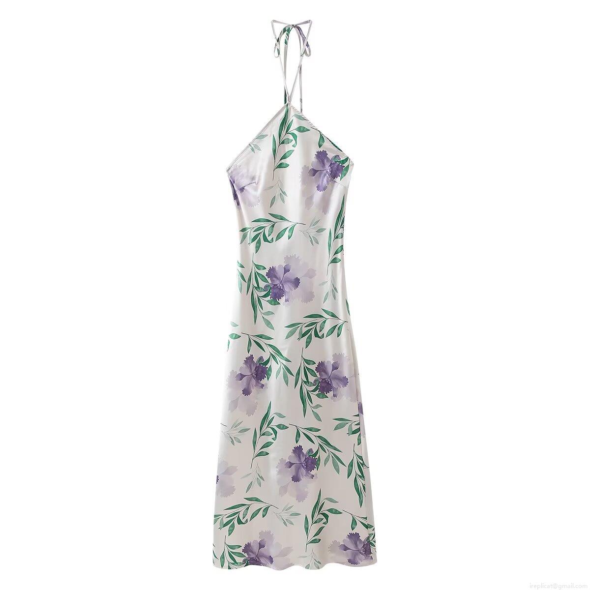 • Women's Sexy Halter Neck Floral Print Maxi Dress 100% Polyester Satin Backless Sleeveless Long Dress For Summer Party Evening Elegant Lady