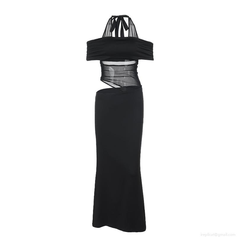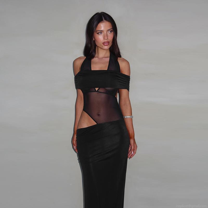 • Women's Sexy Halter Neck Maxi Dress Black Cutout Mesh Patchwork Sleeveless Slim Fit Backless Long Dress For Party Club Night Out Summer Spring