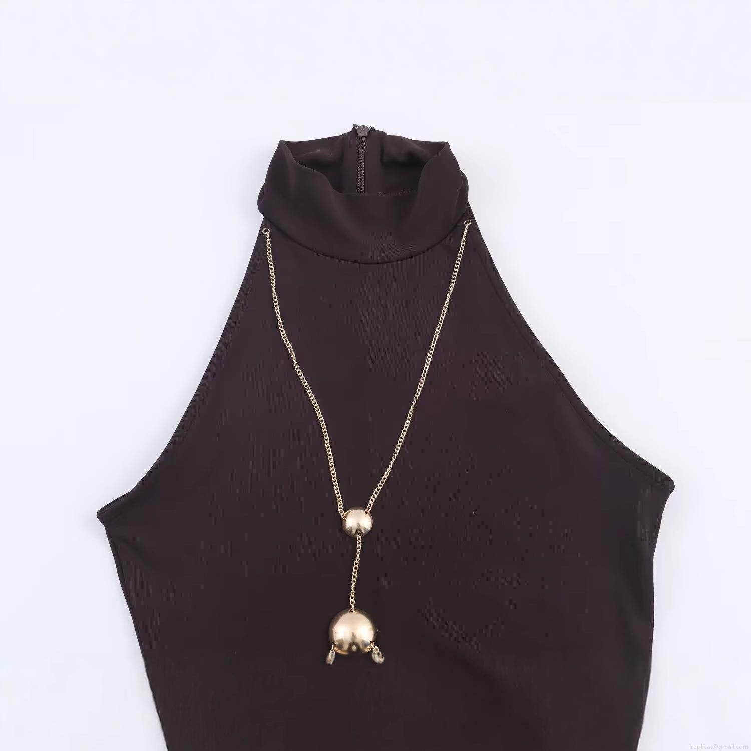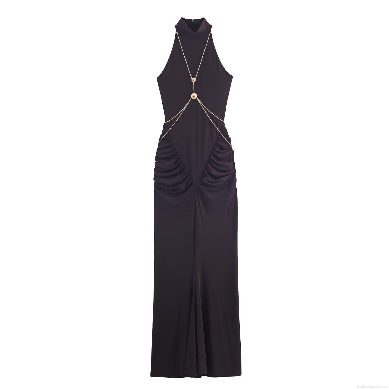 Women's Sexy Halter Neck Maxi Dress With Gold Metal Chain Decoration Sleeveless Bodycon Ruched Party Evening Long Dress
