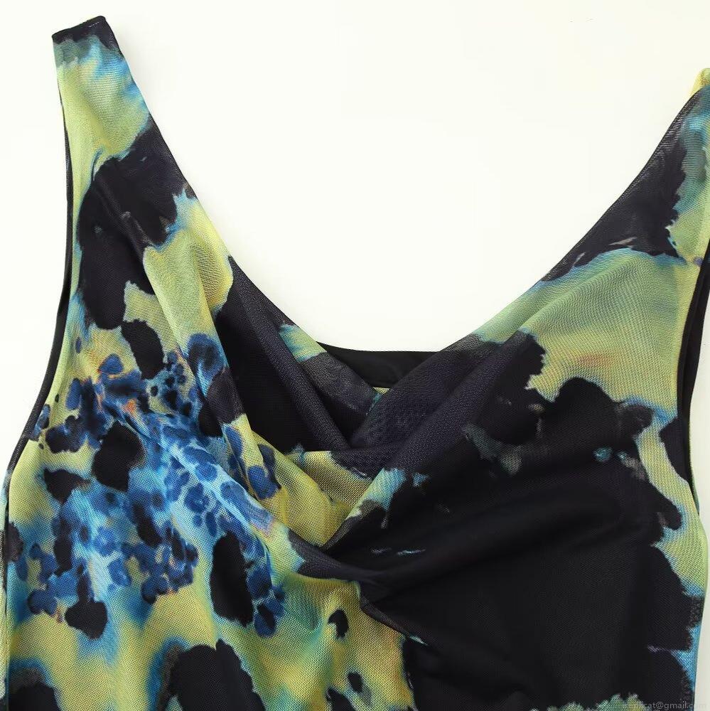 • Women's Sexy Halter V-Neck Maxi Dress Abstract Marble Print Sleeveless High Waist Mesh A-Line Long Dress with Scarf Detail for Summer Party Clubwear