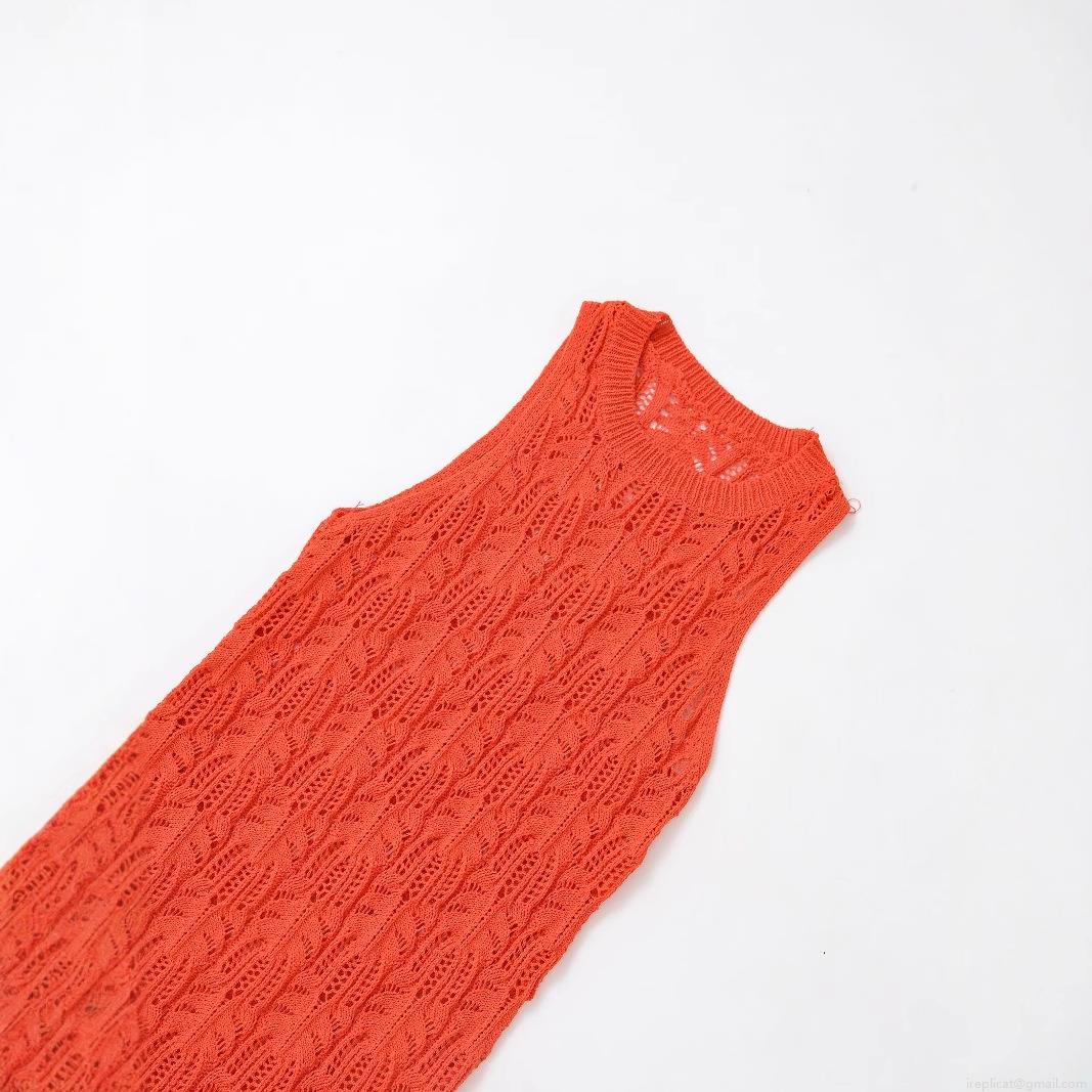 Women's Sexy Hollow Out Crochet Maxi Dress Mercerized Cotton Sleeveless Round Neck Orange Red Knitted Bodycon Long Dress For Beach Vacation Party
