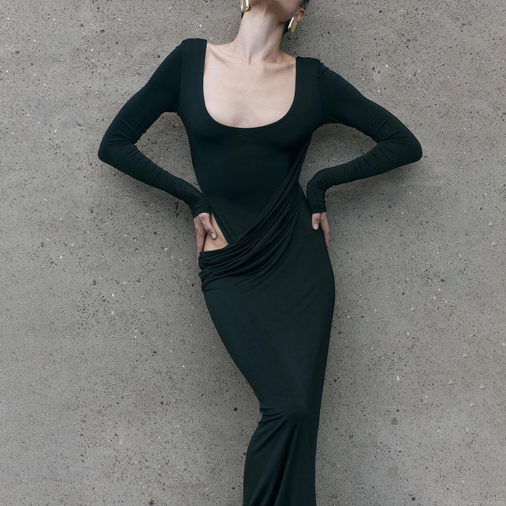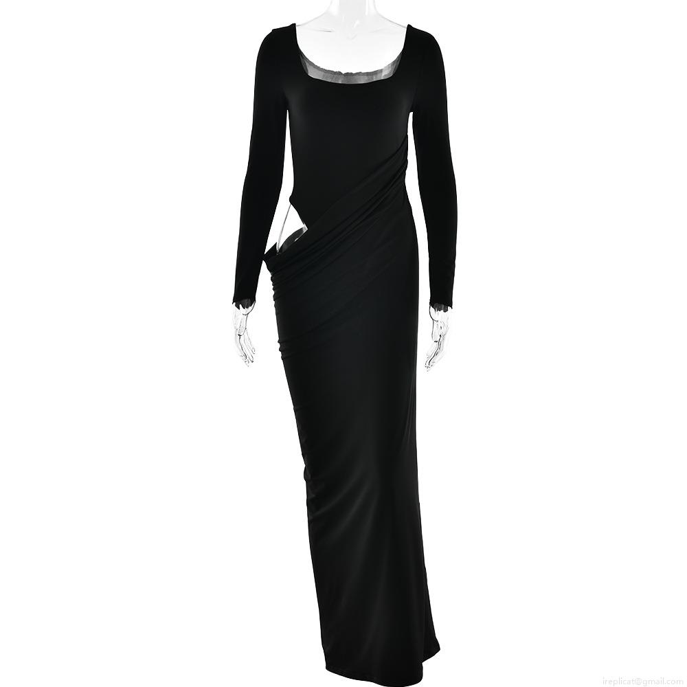 • Women's Sexy Hollow Out Ruched Bodycon Maxi Dress Long Sleeve U-Neck Milk Silk Polyester Slim Fit Club Party Evening Gown
