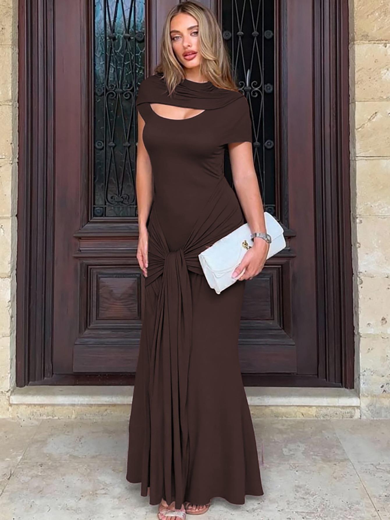 Women's Sexy Hollow Out Slim Fit Maxi Dress 95% Polyester 5% Spandex High Neck Ruched Waist Knot Elegant Short Sleeve Dress for Party Club Night