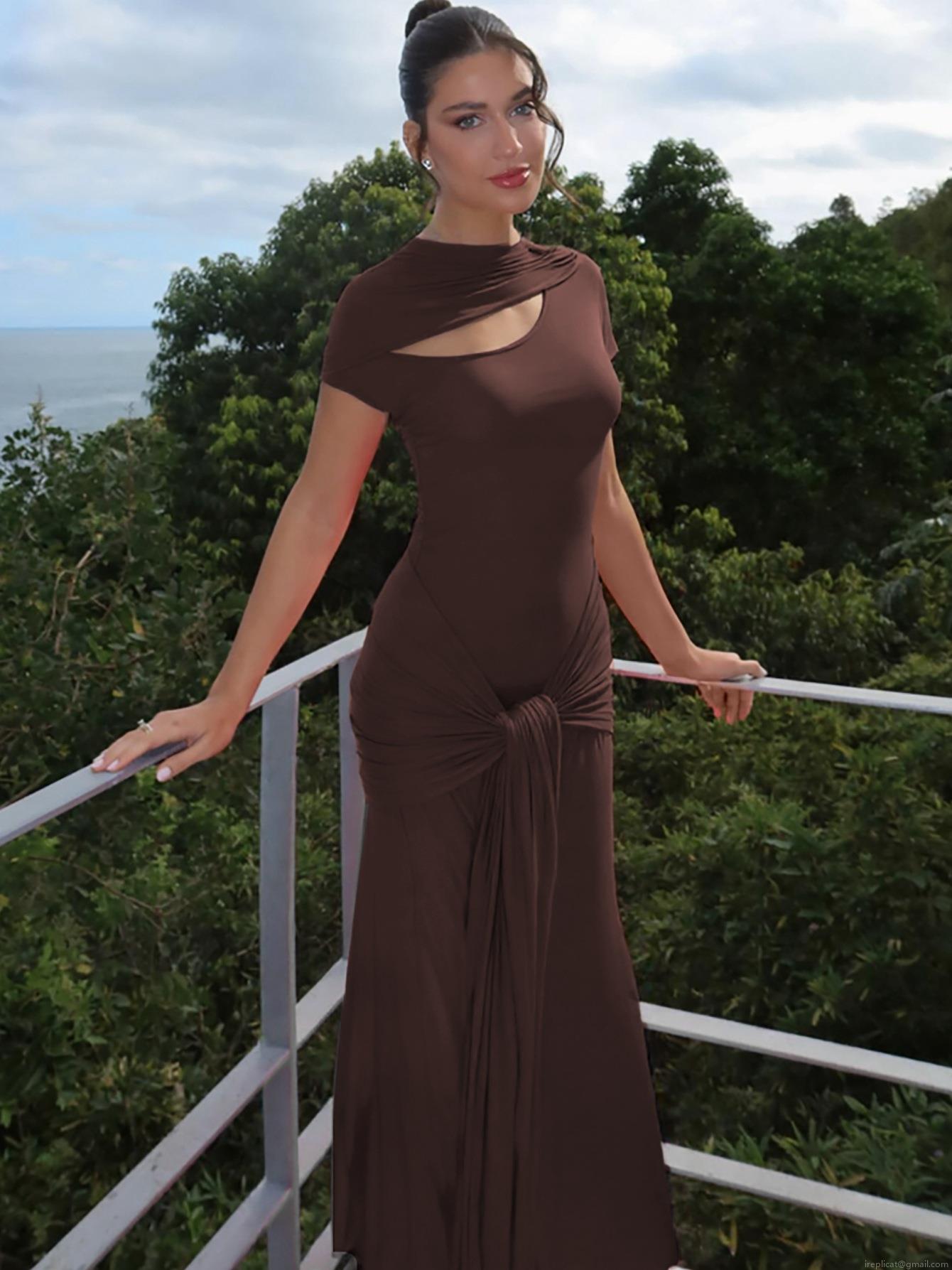 • Women's Sexy Hollow Out Slim Fit Maxi Dress 95% Polyester 5% Spandex High Neck Ruched Waist Knot Elegant Short Sleeve Dress for Party Club Night