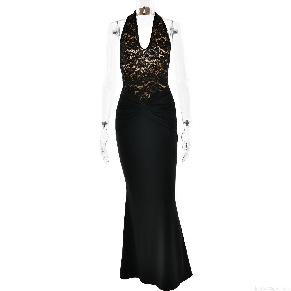 • Women's Sexy Lace Halter Neck Maxi Dress Slim Fit Backless Sleeveless Milk Silk Evening Party Long Gown Bodycon Fish Tail Dress