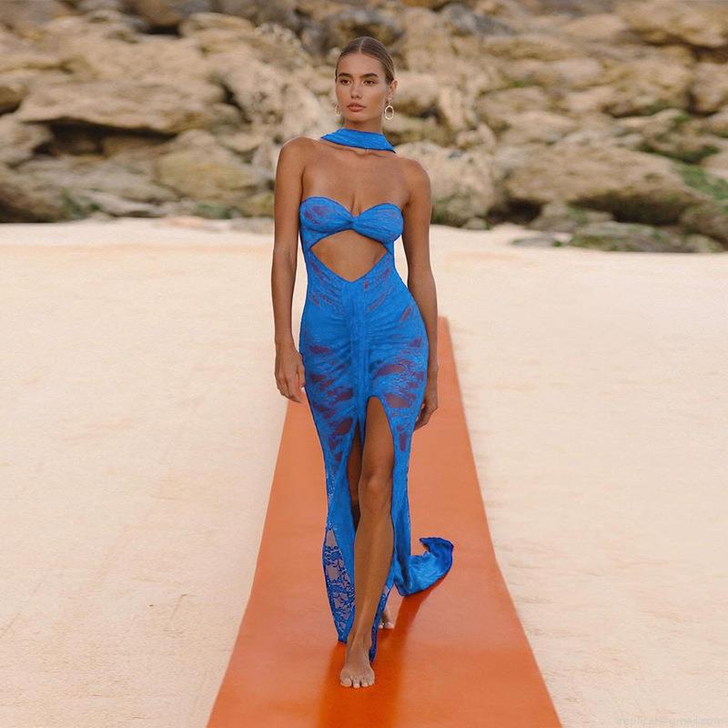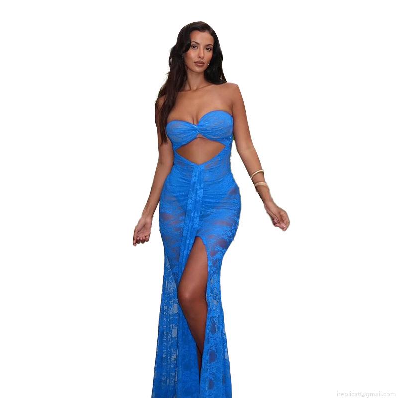 • Women's Sexy Lace Hollow Out Maxi Dress Nylon Spandex Mesh Tube Top High Slit See-Through Beach Resort Party Vacation Sleeveless Long Evening Dress