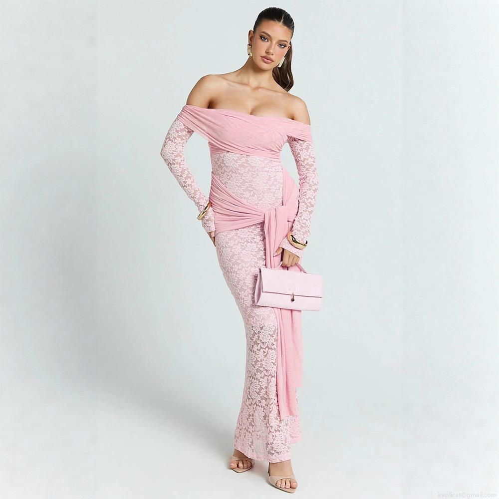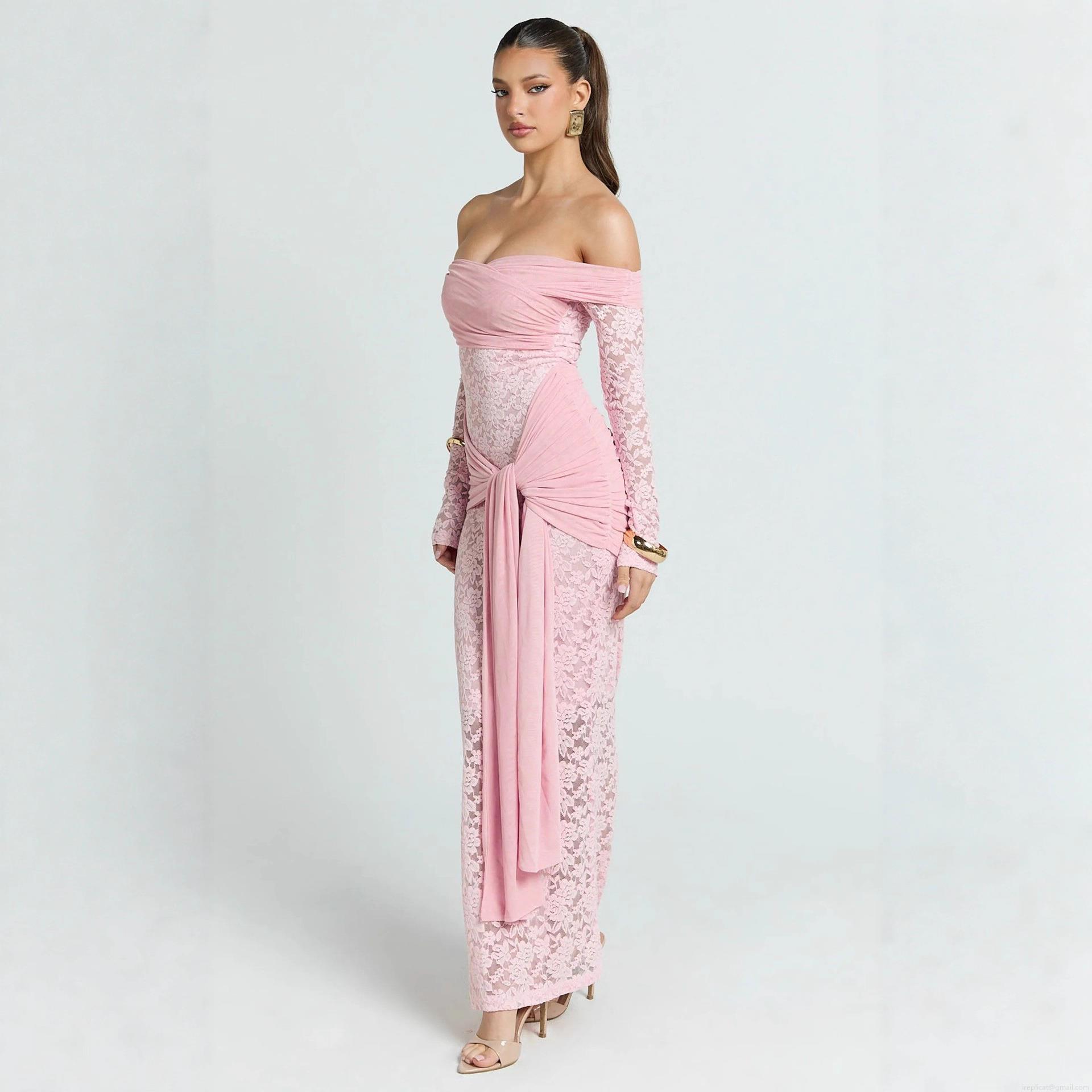 • Women's Sexy Lace Off-Shoulder Maxi Dress Long Sleeve Backless Transparent Mesh Patchwork Slim Fit Evening Party Night Out Clubwear Pink Long Gown
