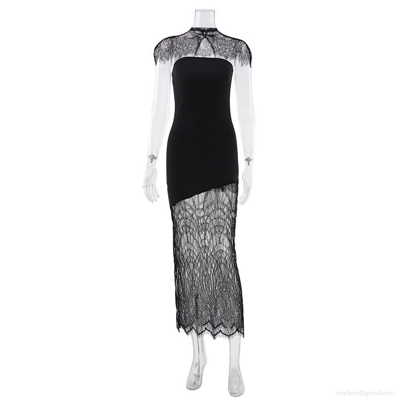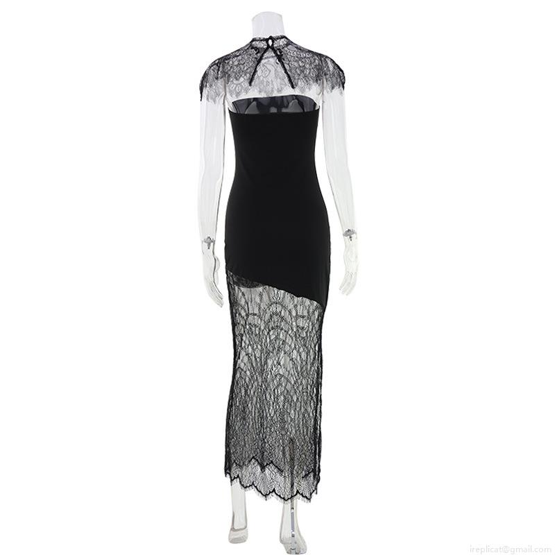 • Women's Sexy Lace Patchwork Bandeau Maxi Dress Elegant Slim Fit Sleeveless Bodycon Evening Party Gown High Waist Long Skirt for Nightclub
