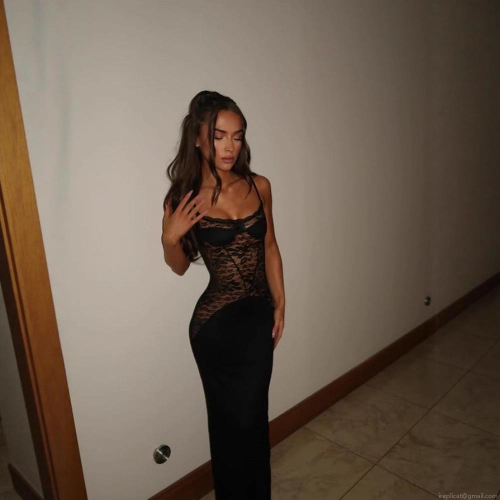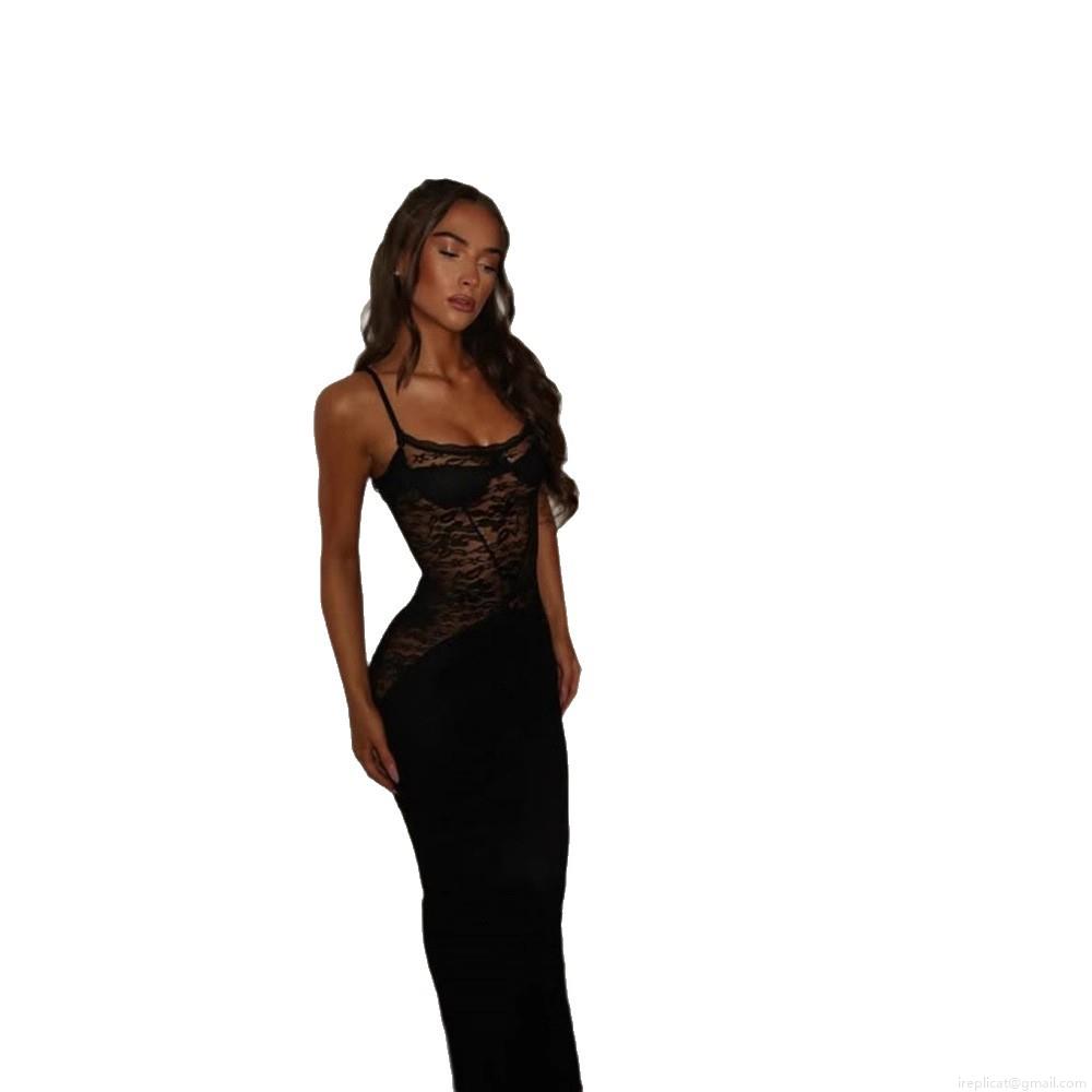 Women's Sexy Lace Patchwork Spaghetti Strap Maxi Dress Elegant Slim Fit Evening Party Bodycon Long Dress Polyester Spandex
