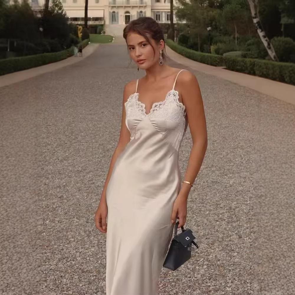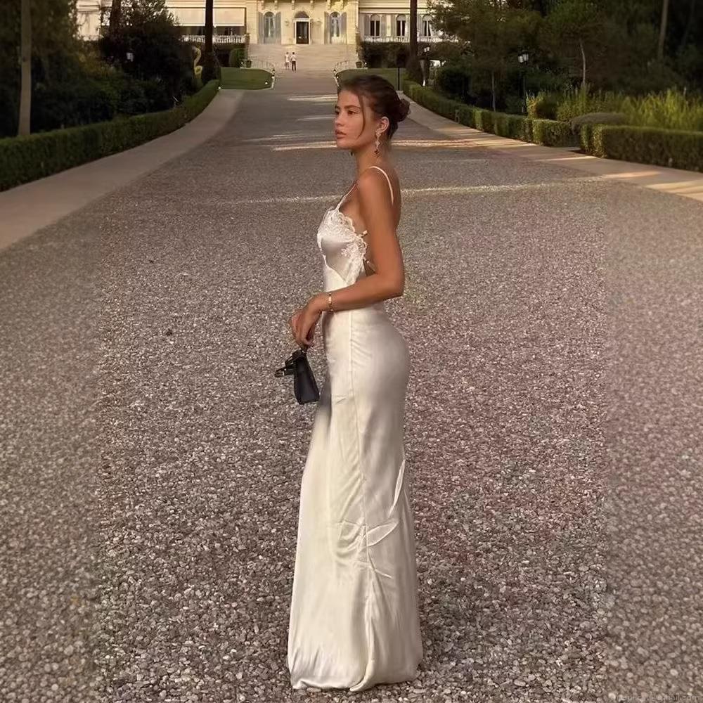 • Women's Sexy Lace Satin Maxi Dress Backless Spaghetti Strap Silk-like Slim Fit Evening Party Long Slip Dress