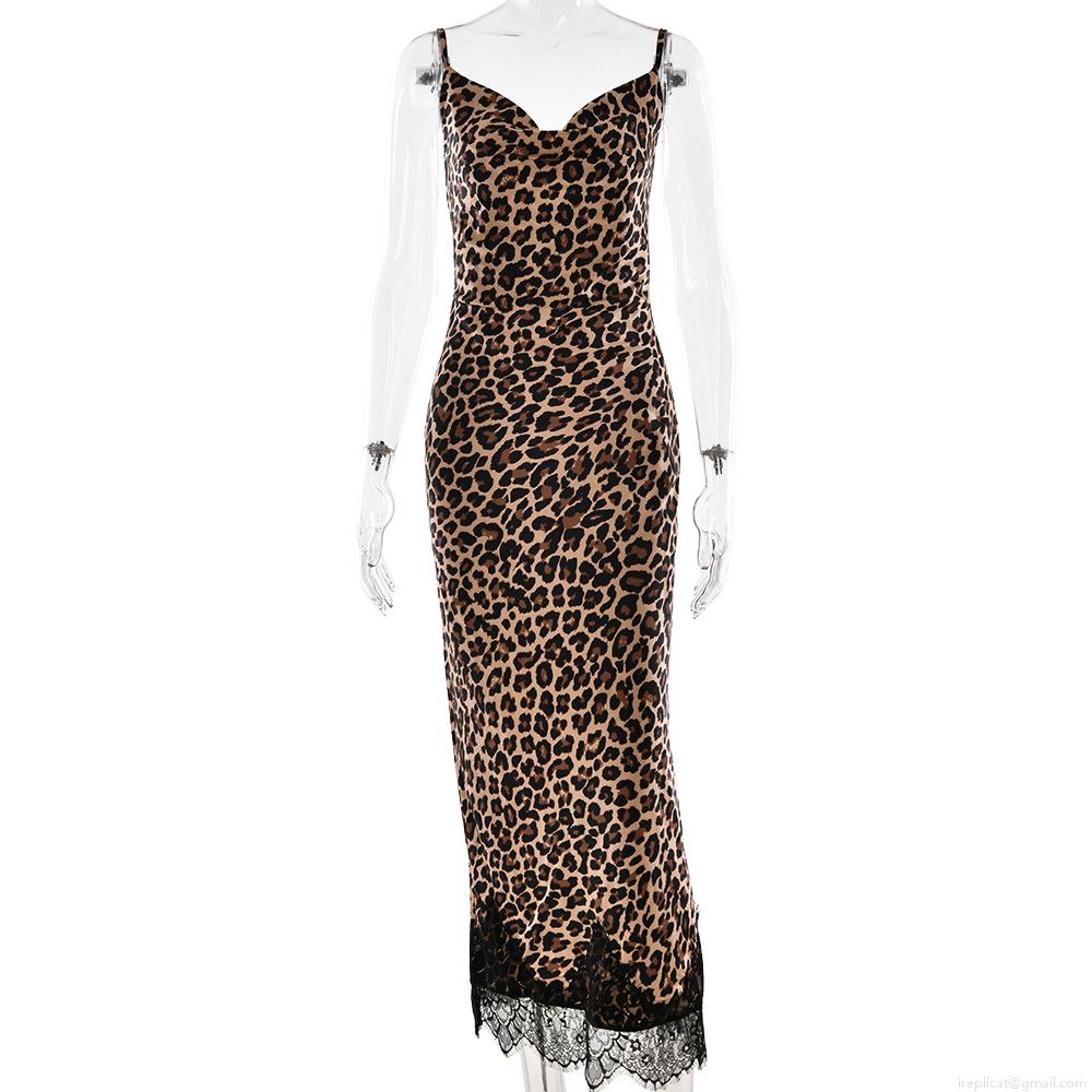 • Women's Sexy Leopard Print Sling Maxi Dress With Black Lace Hem Satin Polyester Slim Fit Slip Dress For Summer Vacation Party Spicy Girl Streetwear