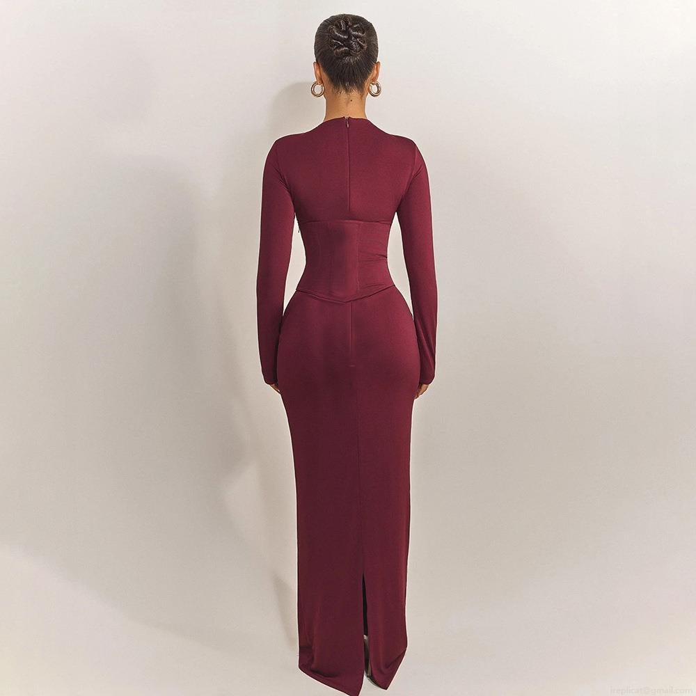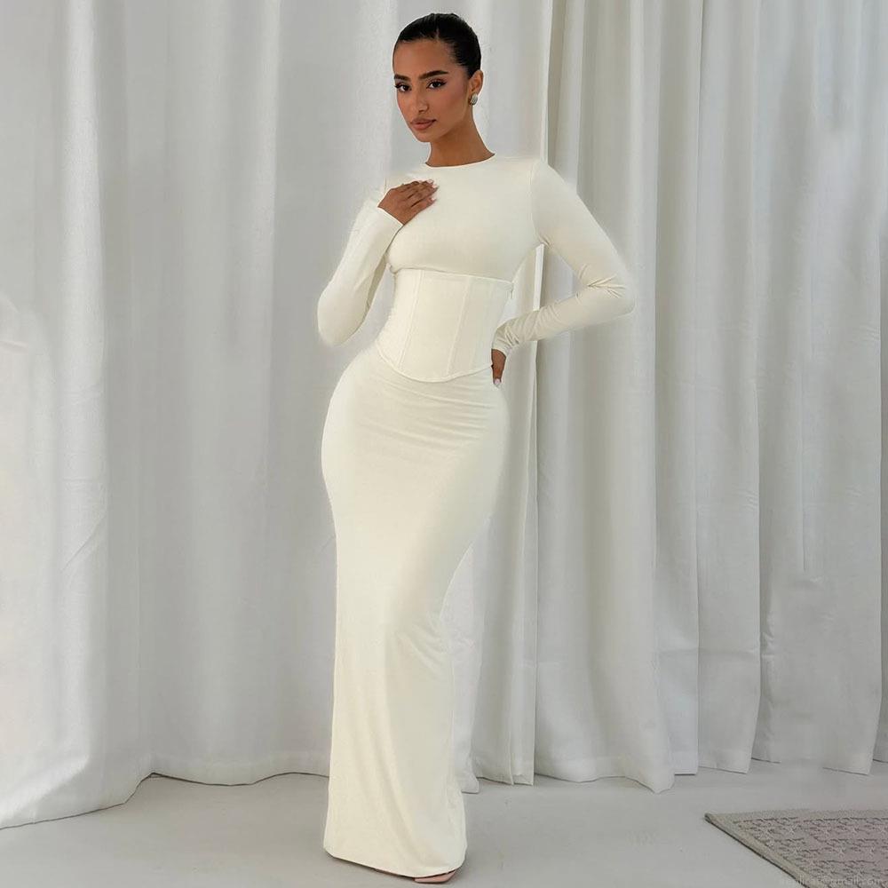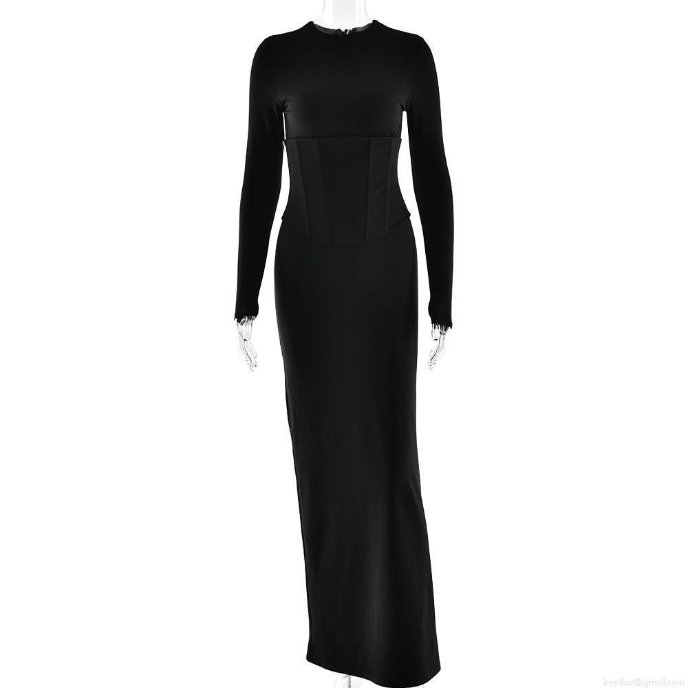 • Women's Sexy Long Sleeve Bodycon Maxi Dress with Corset Bone Waist Design Solid Color Round Neck High Waist Slim Fit Split Floor Length Party Evening Dress
