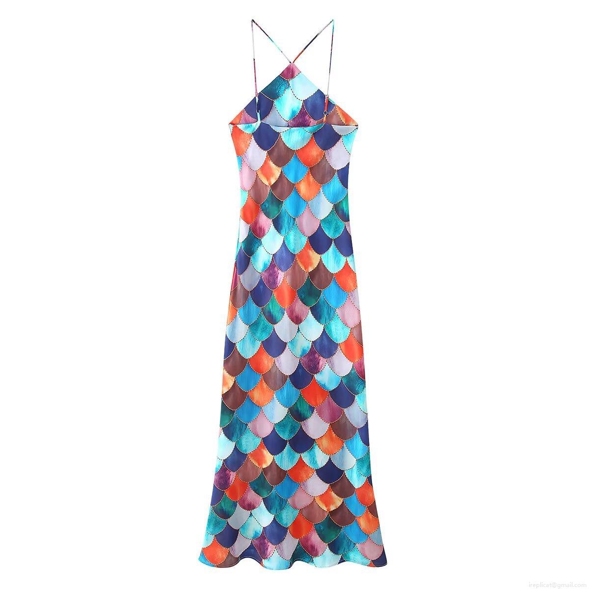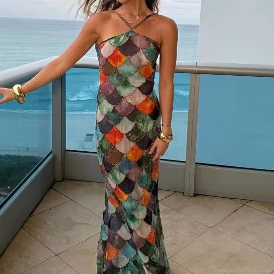 • Women's Sexy Mermaid Fish Scale Print Maxi Dress Halter Backless Polyester Long Sundress For Vacation Beach Party