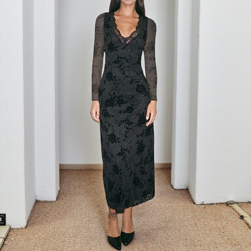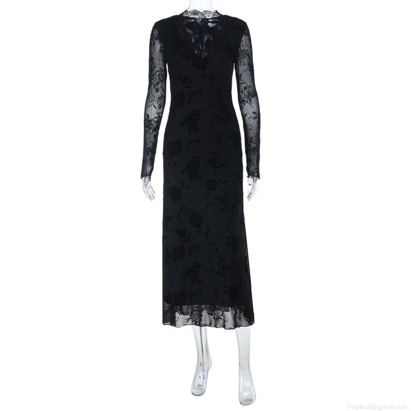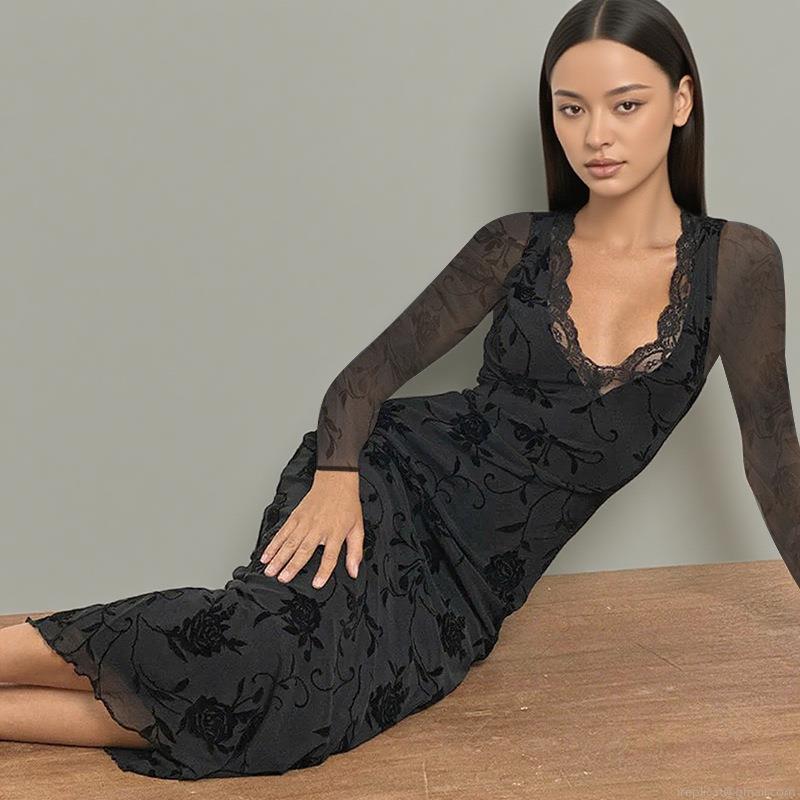 • Women's Sexy Mesh Flocking Rose Floral Print Long Sleeve Maxi Dress Vintage Slim Fit Sheer Party Evening Dress For Ladies