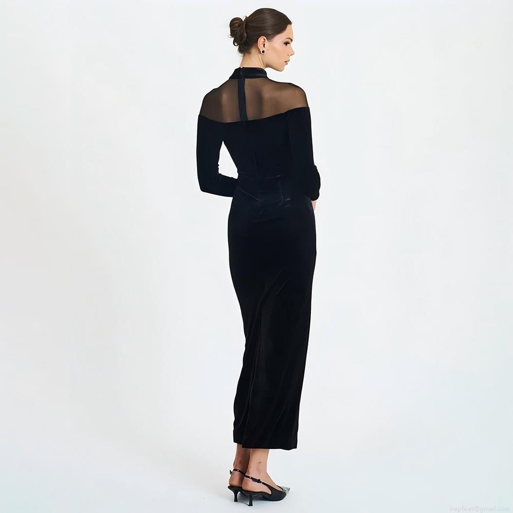 • Women's Sexy Mesh Patchwork Velvet Maxi Dress High Neck Long Sleeve Bodycon Slim Fit Long Evening Party Dress Elegant Clubwear