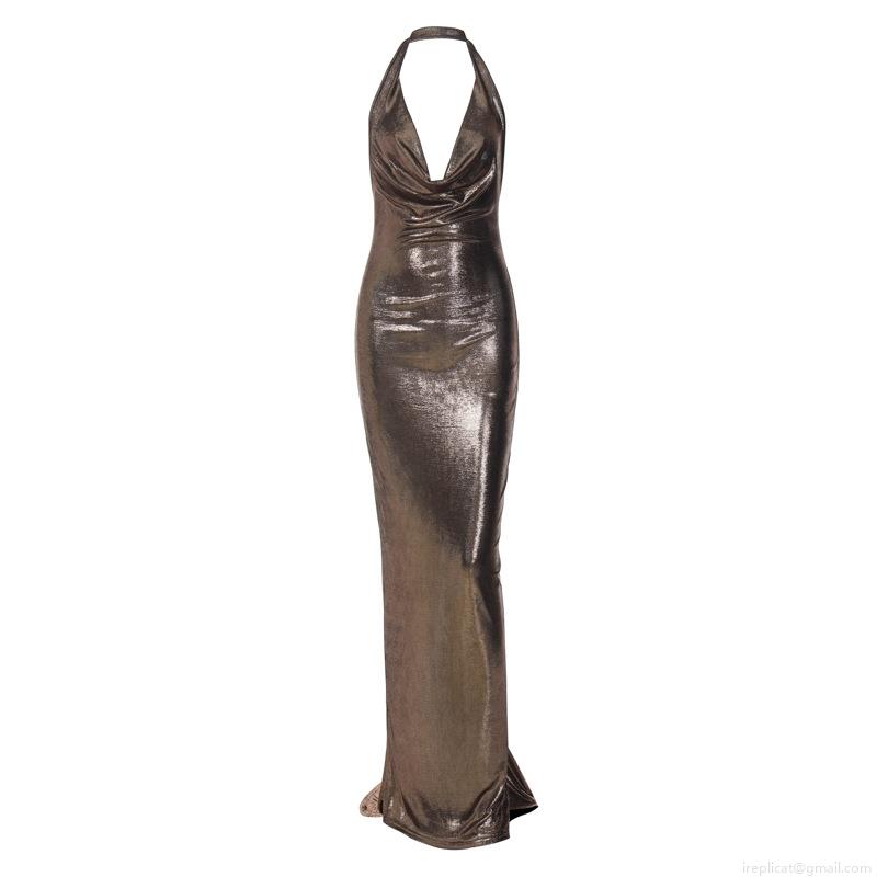 • Women's Sexy Metallic Halter Neck Backless Maxi Dress Elegant Deep V-Neck Pleated Long Gown For Evening Party Wedding Club Night