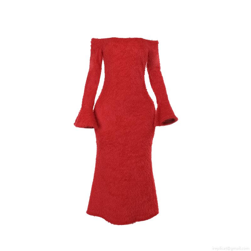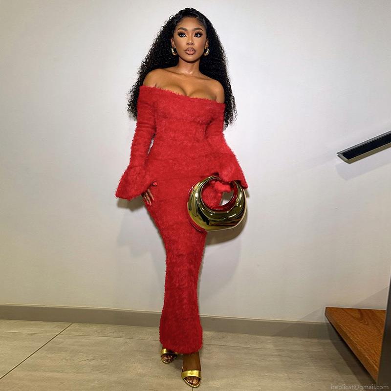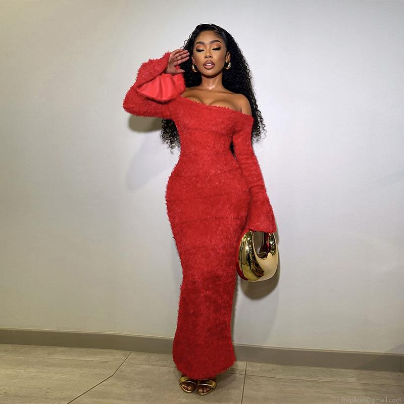 Women's Sexy Off-Shoulder Long Sleeve Faux Fur Maxi Dress Slim Fit Backless Flare Sleeve Red Bodycon Evening Party Christmas Clubwear Dress