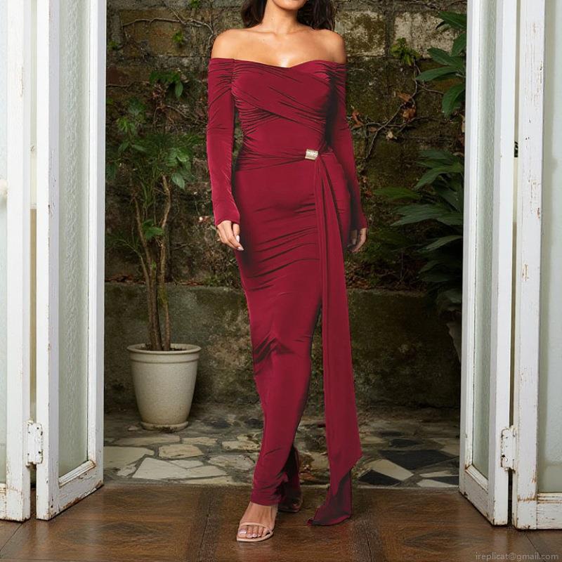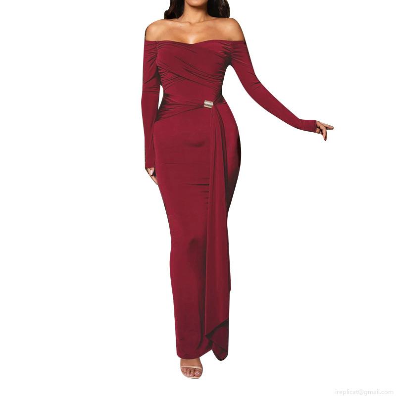 • Women's Sexy Off-Shoulder Long Sleeve Maxi Dress Elegant Ruched Waist With Metal Buckle Solid Color Slim Fit Polyester Spandex Party Evening Dress