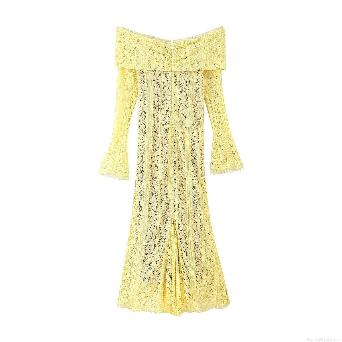 Women's Sexy Off-The-Shoulder Lace Hollow Maxi Dress With Lining Elegant Long Sleeve Backless Bow Yellow Evening Party Dress