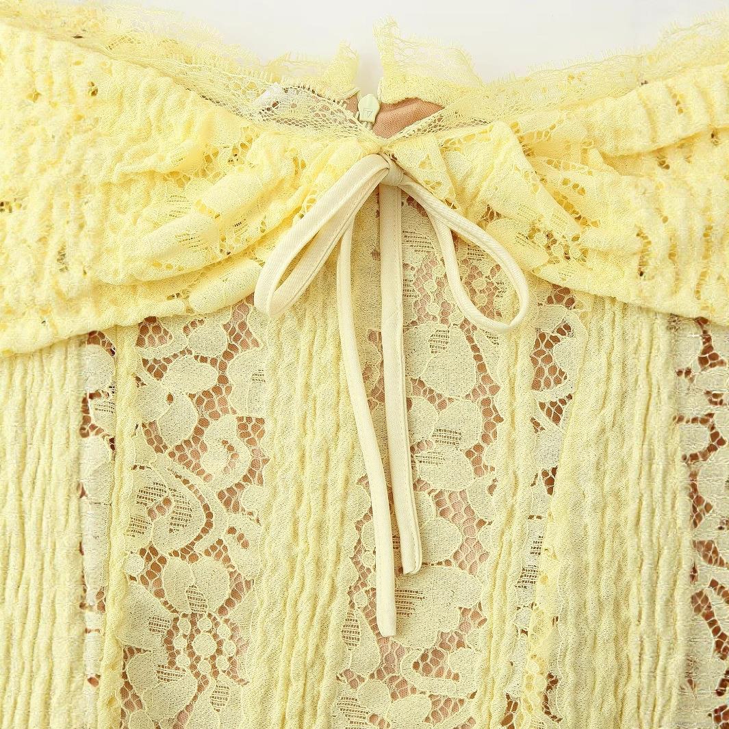 • Women's Sexy Off-The-Shoulder Lace Hollow Maxi Dress With Lining Elegant Long Sleeve Backless Bow Yellow Evening Party Dress