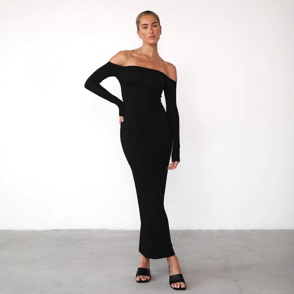 Women's Sexy Off-The-Shoulder Long Sleeve Maxi Dress Slim Fit Solid Color High Stretch Polyester Spandex Bodycon Long Gown For Party Evening Elegant Lady